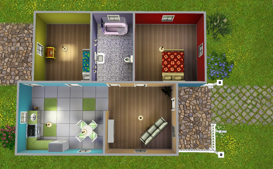 Starter home in colorful scheme (for neutral scheme, see Bland - Starter Home Series). Can be purchased with starter money and has the best items you can afford on a limited budget with a little leftover for expenses. Basic layout will be easy to redecorate or renovate as your fortune increases.