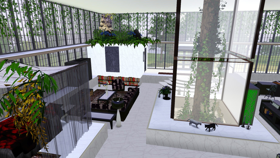Botanica.This is a large open style house with a very tall fir tree growing out the middle and through the roof,the tree is surrounded by windows and completely closed in.The lot itself is also well treed with firs.Tons of windows provide plenty of sunlight for the many ferns growing throughout the house,as well as the indoor fern/ rock garden on the roof of the bathroom.Nice sized entertainment area with music and a bar.Sitting area has a fireplace.Also features beautiful marble floors,statues and pillars.There is room for 2 car lots.