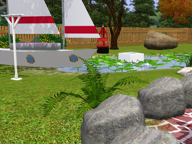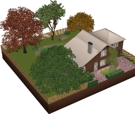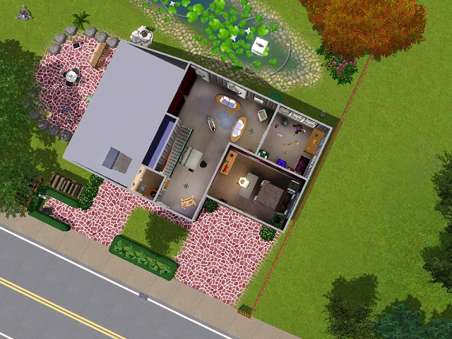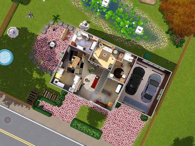Camelina is a big house for a 4 or 5 Sims family. It includes a living room with a chimney, a bathroom at the ground floor, 3 bedrooms, a toilet in the 1st floor, a playroom, a garage, a terrace and a flowery garden.