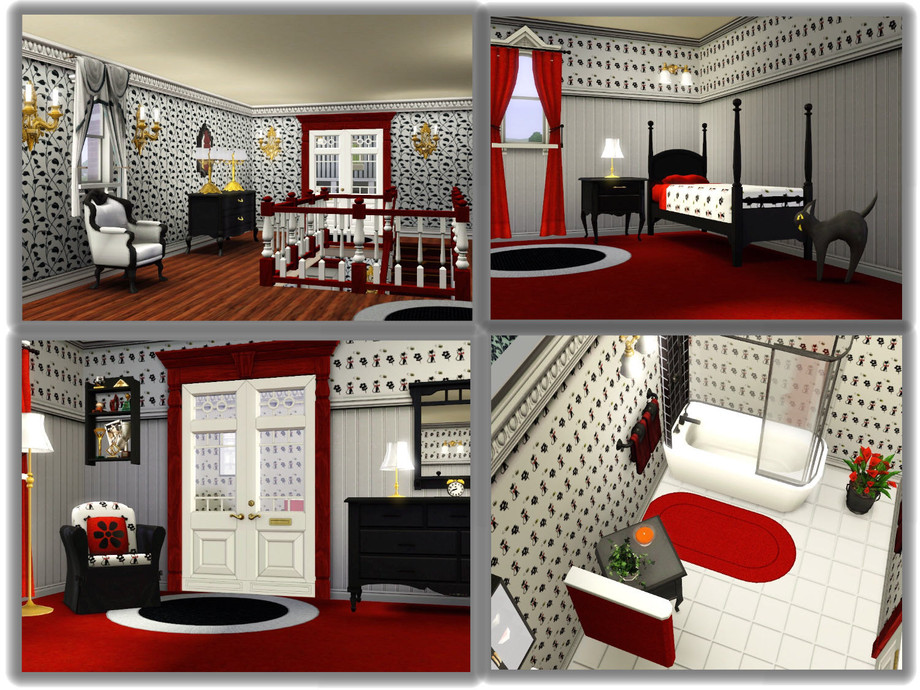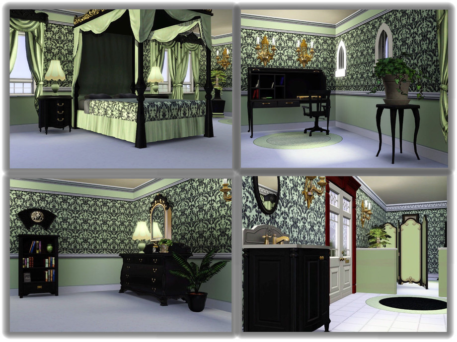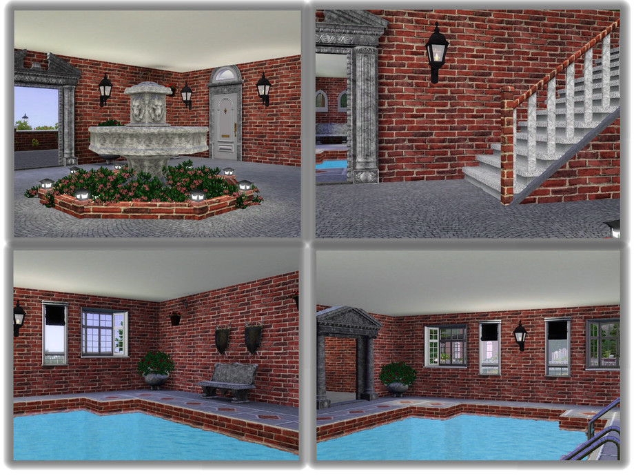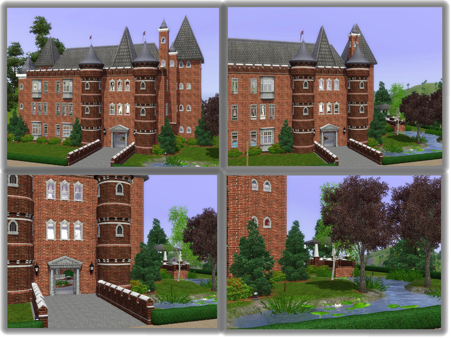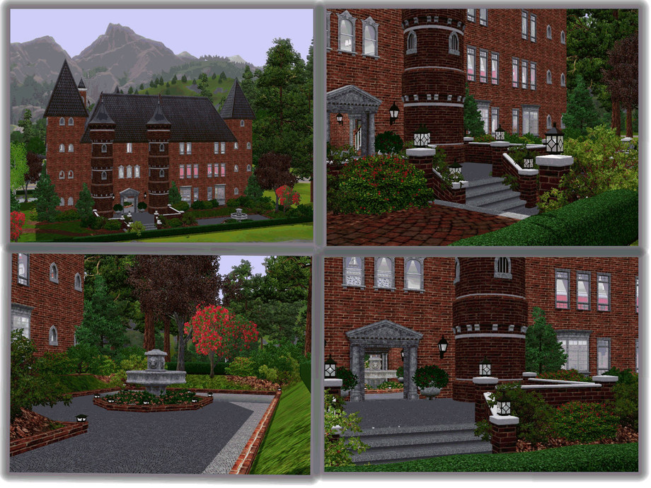 This small stone castle manor is perfect for those Sims who can't afford the large estates. Even though the grounds are not spacious, they can still enjoy the luxury of a beautiful pond, a terraced backyard with a fountain and a large patio for outdoor dining. There is also a covered gazebo for those late night chess games. It has a walk out pier for fishing. This castle is unique with its lovely enclosed courtyard. There is a fountain in the center and an enclosed swimming pool off the courtyard. There is also a weight room and a full bath on the ground floor. The upstairs has the main living area. The manor is decorated in regal shades of black, red, white and mint green. The second floor has a large foyer, a living room, a full bath, a kitchen and a formal dining room with a bar. The third floor has a large foyer, a master bedroom with bath and dressing nook. There is an office area in the master. Your Sims can enjoy an art room right off the master or this can be converted to a nursery in the future. There is also a child's room with an adjoining bath. Enjoy!