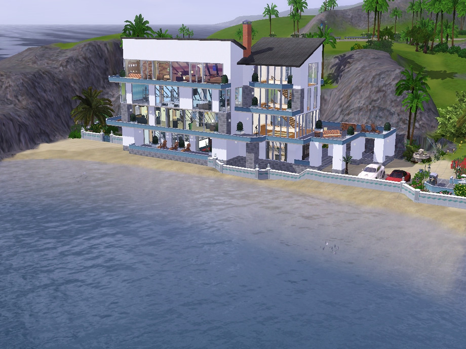 Situated with one stylish, modern foot in the ocean, this spacious mansion is an absolute must for the high-flying, wealthy and discerning Sim who doesn't care it's been built all over the beach! Features: Exterior - al-fresco dining/BBQ area, parking for two cars, covered walkway to rear private garden with outdoor seating and pool, access to private beach; Ground floor - Foyer, contemporary fitted kitchen/diner complete with fire, 1/2 bathroom; First floor - Formal lounge with fire, T.V. lounge, bar area, bathroom and outdoor seating/bar and entertainment area; Second floor - Media/Games room, gym, hobbies/recreation room, bathroom; Third floor - Master and guest bedrooms, both en-suite.