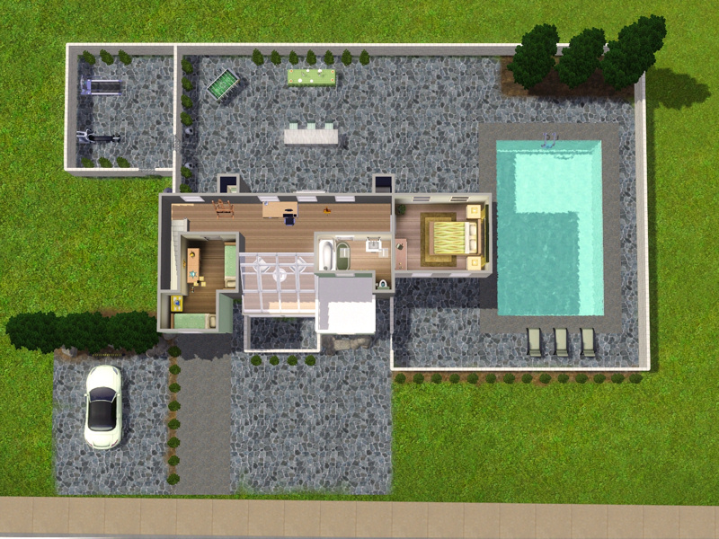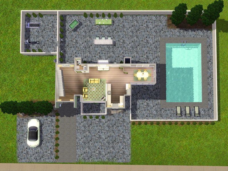 Outdoors: Pool, eating area, exercise area.