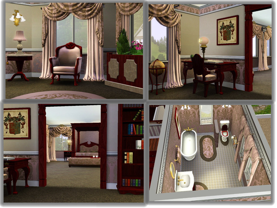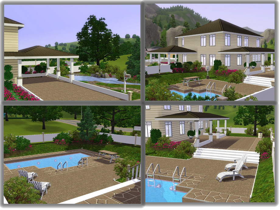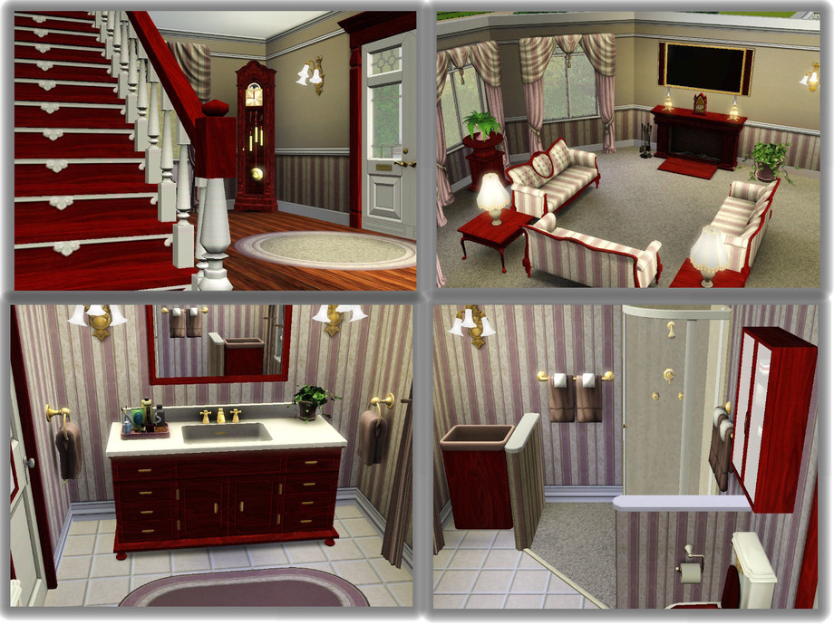 This simple little modern Victorian will be perfect for a single Sim or couple. Built with the smaller lots in mind, this home offers simple living in a compact area. There is a parking space under a covered carport, patios, a pool and a beautiful pond to fish in. The interior is done in beige, brown and rose colors. There is a small entrance foyer with a triple staircase that leads into a large family room with a fireplace and media. The kitchen has a prep island and an informal dining area. There is a laundry room off the kitchen and a full bath. The upstairs has a large foyer with room for an art nook, a master bedroom with an attached office/library and master bath. This home was built at 2300 Pinochle Point in Sunset Valley. Enjoy!