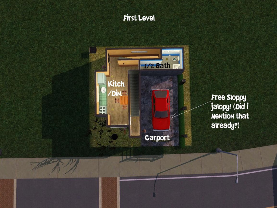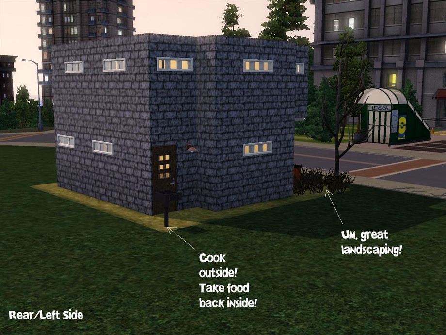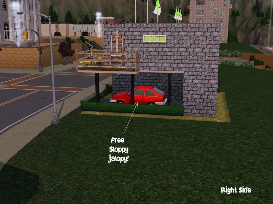 Perfect for a single Sim who's just starting out in the big city, this admittedly ugly monstrosity was almost torn down several times, but was saved by the local city council because it was 'Drawing Sim Suburbanites to our fair city time and again', in turn eventually keeping them in the city (After they moved out, of course). Comes also with a Sloppy Jalopy! Enjoy! (If you can stomach it) :)