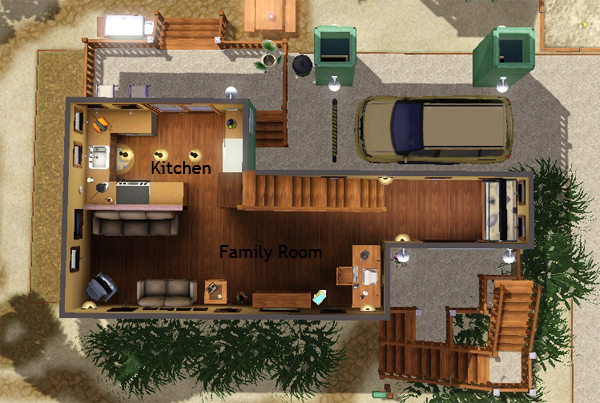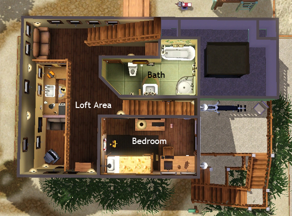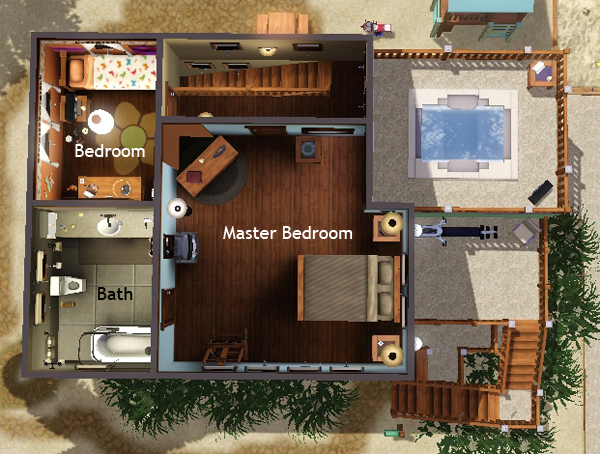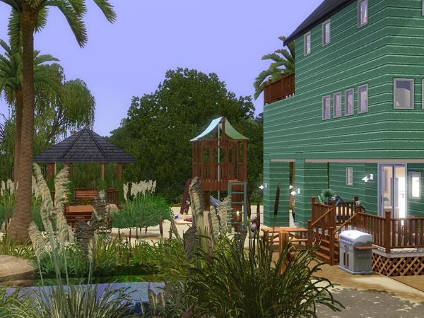 This 3-story beach themed house features 3 bedrooms, 2 full baths and a kitchen/family room area. It has a hot tub off the third floor deck, a carport, gazebo, swimmable pond and a kid's play area out back. It comes fully furnished and has been playtested. No CC was used. Originally built on 17 Sweetwater Loop in Twinbrook.