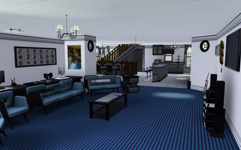 Due to the phantom nature of the building (using the CFE cheat) the 2nd through 5th floors only exist as a shell, but the illusion is quite striking. Phantom fully working 1st to 6th floor bridging stairs are used, but I deleted the 5 story walls I had surrounding the stairs so that the 1st floor would look natural. The 8th floor is the four bedroom part of the fully furnished two floor penthouse, with bathroom and separate family room area with a chess set. The 9th floor is the main living/working area with a luxury open plan kitchen, dining area, living room/study, laundry and a 2nd bathroom. To break up the open floor plan I have added decorative columns with four in-wall 15 inch speakers to complete the 7.1 sound system as shown in the screen shots! The roof top has a barbecue area and a telescope. Included are two computers, wall mounted HD TV with hi-fi stereo right below it, guitar, and two painting stands. Included on the first floor are 3.5 bicycles with stands and a Vorn pickup truck.