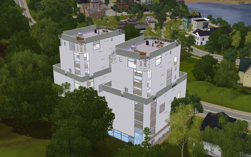The objective for this building was to make a skyscraper apartment building with as large a living space as possible, high up in the air, which could be built on virtually any lot, hence a 20x30 was chosen. It looks cool when placed as a pair, as for example at 174 and 178 Savannah Lane, Twinbrook (two 20x30 lots).