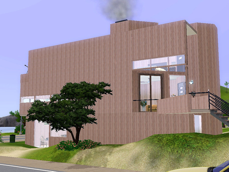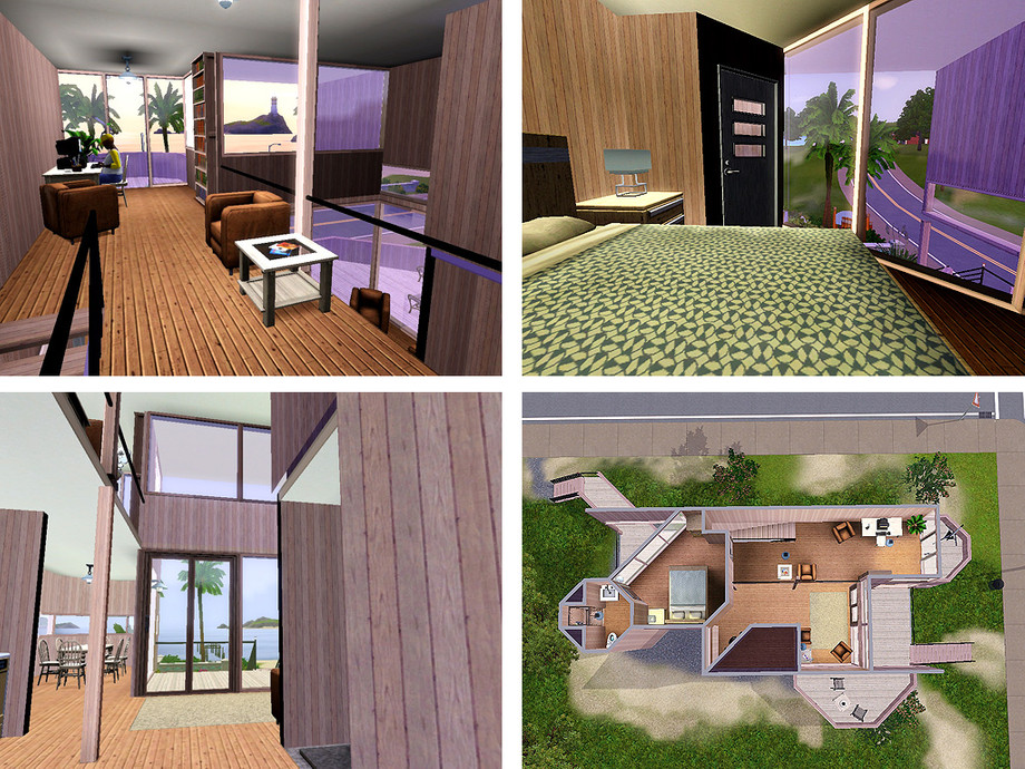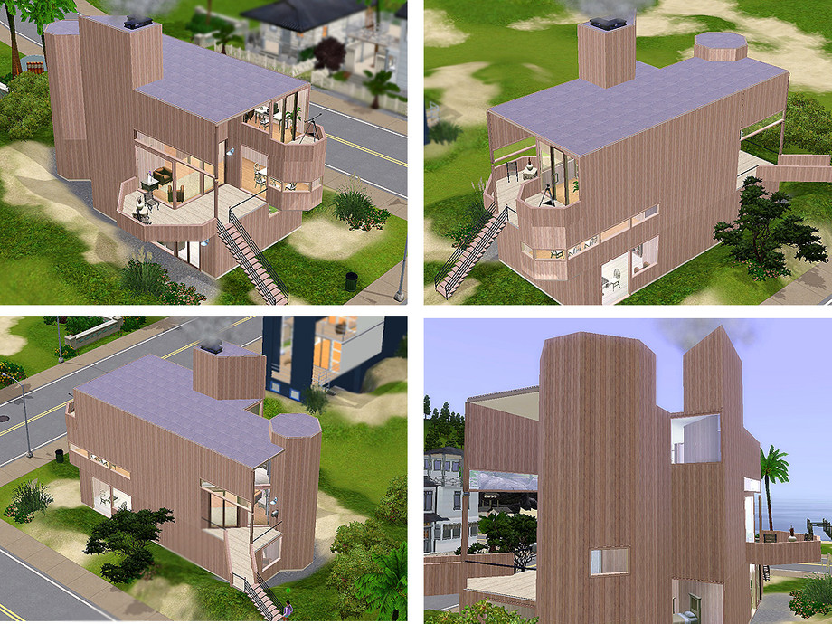 Inspired by a beachside home by Gwathmey-Siegel (1968). The house is approached by a diagonal bridge, while inside the space opens up to a shaded window wall. The vertical siding evokes the worn feeling of the shoreline, while the varied windows frame views of Sunset Bay. 3 BR, 2.5 BA includes large deck, game room, loft office, and fireplace. 212 s.t. [square tiles] Play-tested. By ARCHITECTURE FRAMED.