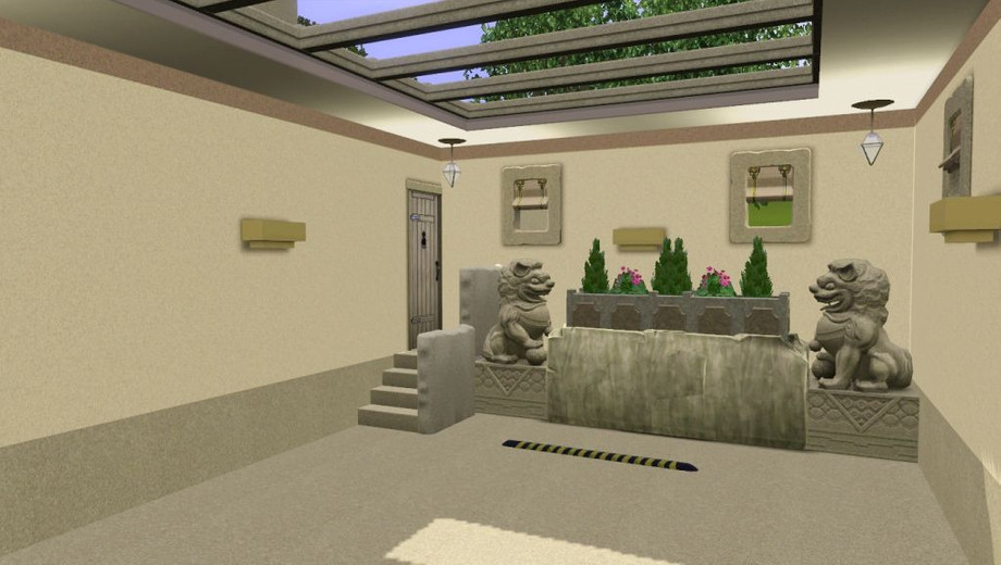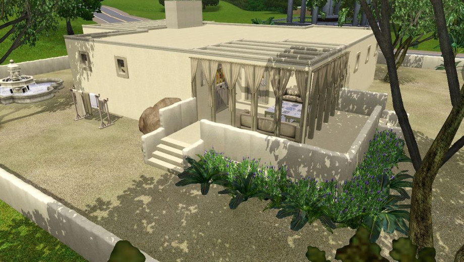 A small middle eastern compound, designed for the Home Designer's Challenge, week 12. Base shell by happyone2009. One bedroom, one bath. Plenty of gathering / meeting space, including a curtained patio. Requires World Adventures expansion pack.