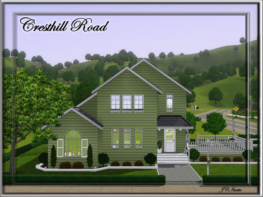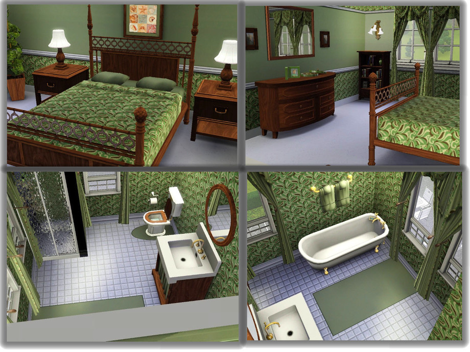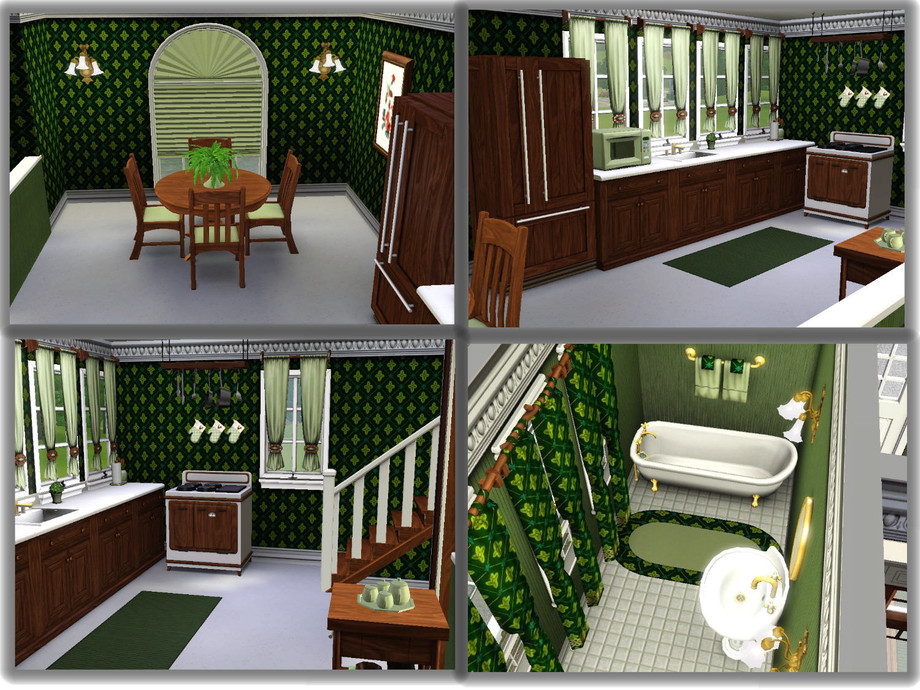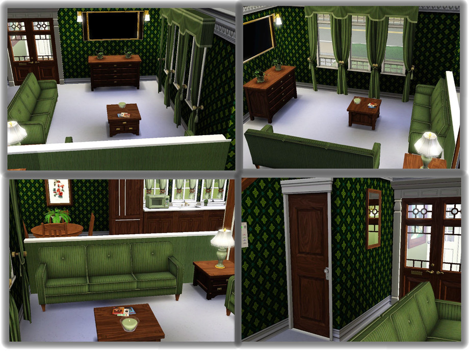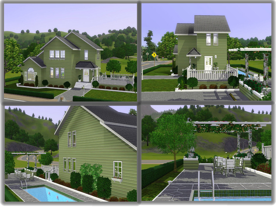 This lovely traditional home will add much charm and presence to your neighborhood. It is a perfect little house for an elderly couple or a single Sim. Its cool green exterior with white trim makes for an inviting welcome. Although small in size and lot, this home is functional and offers added features of a driveway, an arbor for chess games and patios for those great barbecues. There is also a good size pool. The interior is just as welcoming with its dark green, brown and white decor. Decorated more in a masculine style, this makes for the perfect home of your favorite male Sim. It has an open living space with sitting and media, a full bath and a kitchen and dining area. There is a master bedroom upstairs with a private bath. This home was built at 91 Landgrab Avenue. Enjoy!