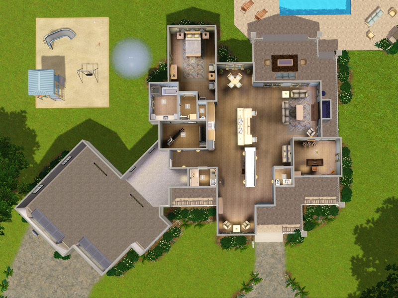 Outdoors: Large pool, plenty of sitting room, fireplace, playground.