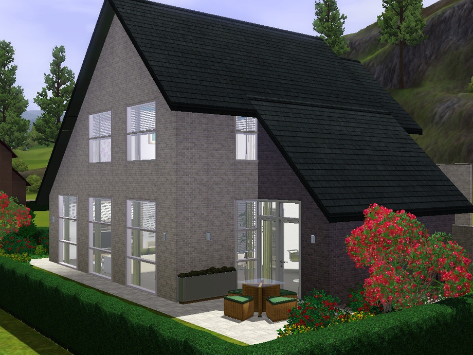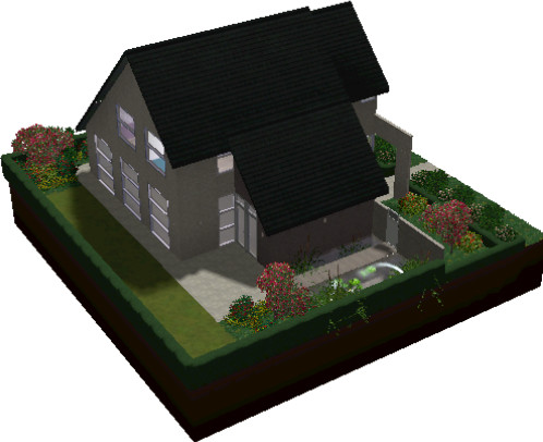 A contemporary family house with open plan living, dining and kitchen area, indoor garage, a bathroom and 3 bedrooms. Outside is a cosy garden with pond.
