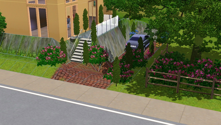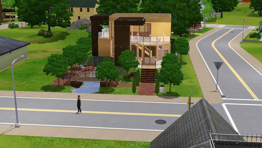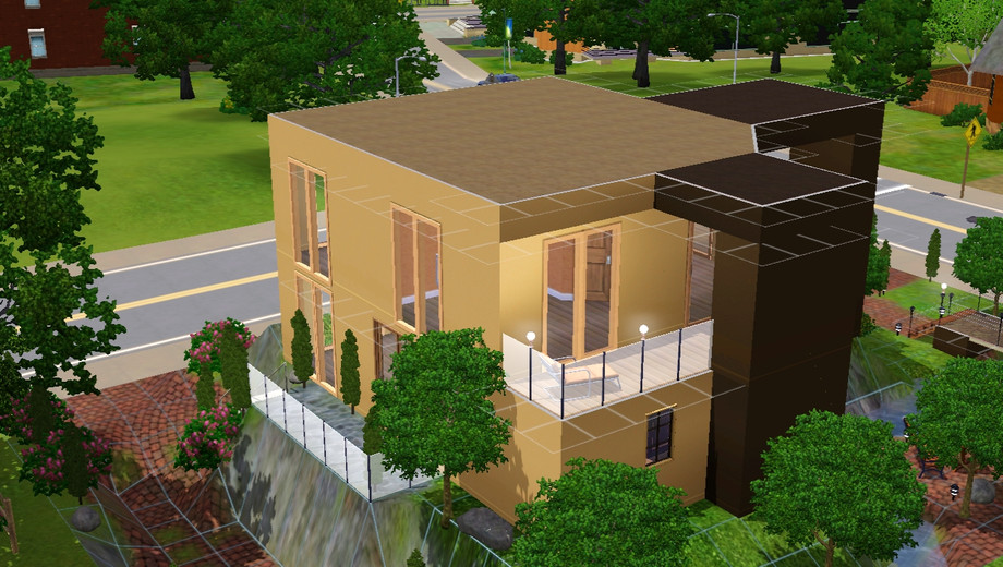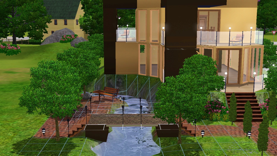 Modern looking house 2 floors, 2 bathrooms, 1 living room, 1 kitchen, 1 master bedroom,1 single bedroom, nice garden seats, nice back and front doors, a nice car parked outside the back door. Ideal for a vacations life, for rich sims :) My first creation