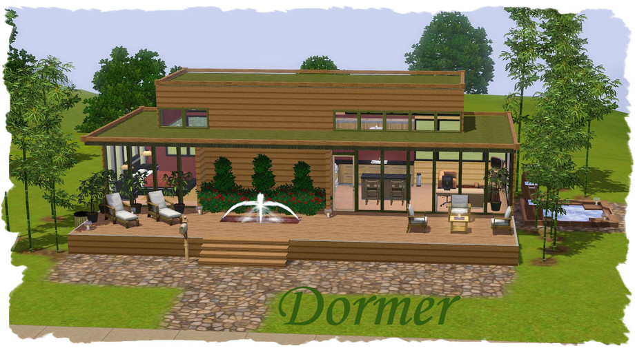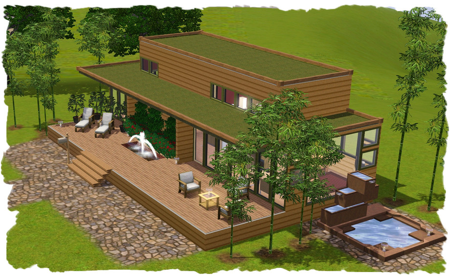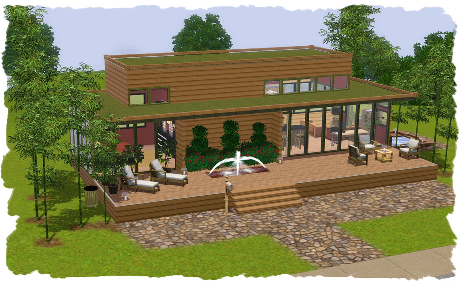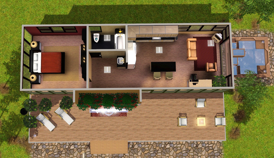 An open-airy greatroom/ kitchen combine with bedroom suit, full bath and Sun deck, delivering a svelte, yet luxurious home for single or newly married sims.
