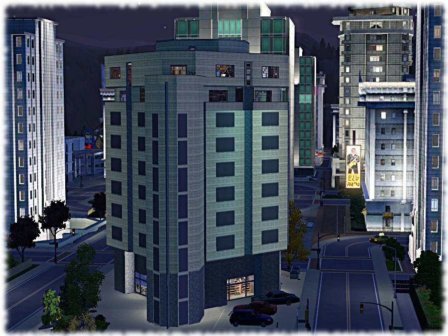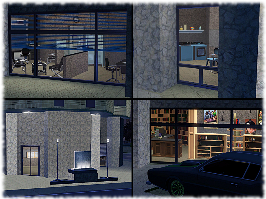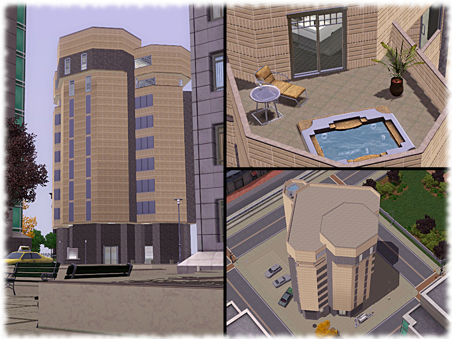 Flat lot built and decorated especially for Bridgeport, but you can place it anywhere at 30x40 size. 10-story building contains hall, meeting-room, security-room, laundry and fake bookstore (just for deco) at the ground floor. Public gym,wc, pool and jacuzzi in the basement.