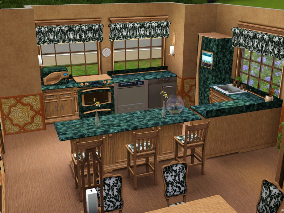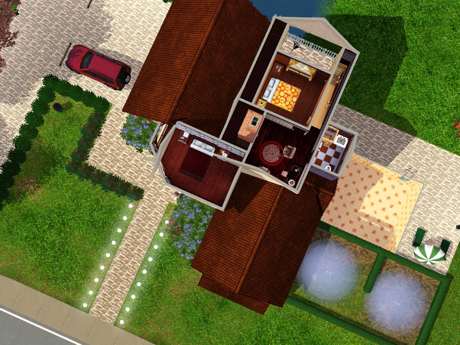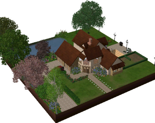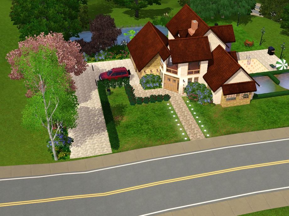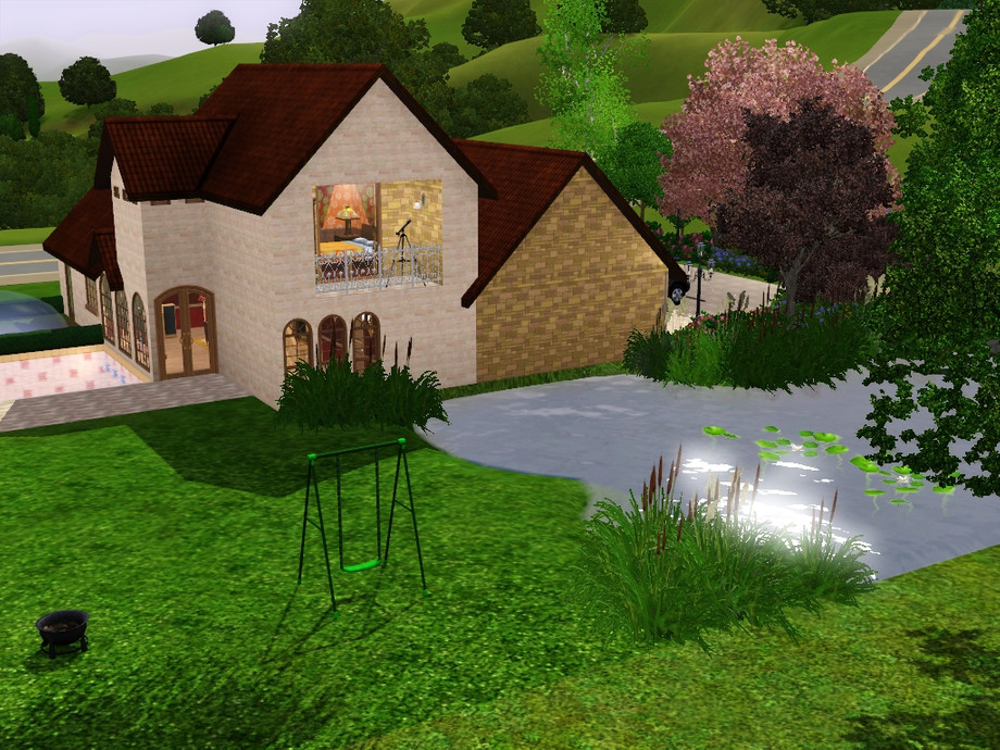 It's quite big lot. But the house is medium size. It has two stories. On the first, there are a kitchen with dinnig area, livingroom, bathromm and hall. From the first floar you can also get to the garage. On the second floar are located two bedromms and the second bathroom. There is also an area for garden, where you can plant trees or vegetables. House had a poll. Lot has a pond, which is located in the backyard. Behind the house i left a little space, where youre sims can playing or do whatever he/she likes.