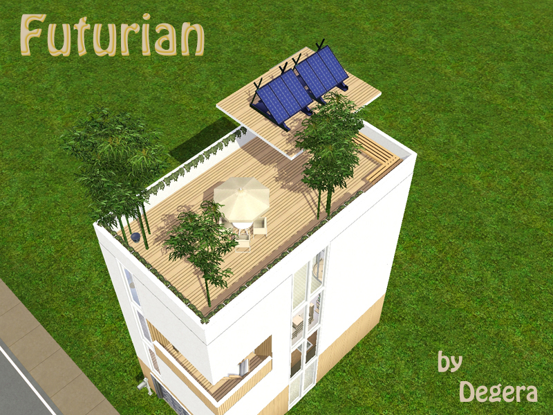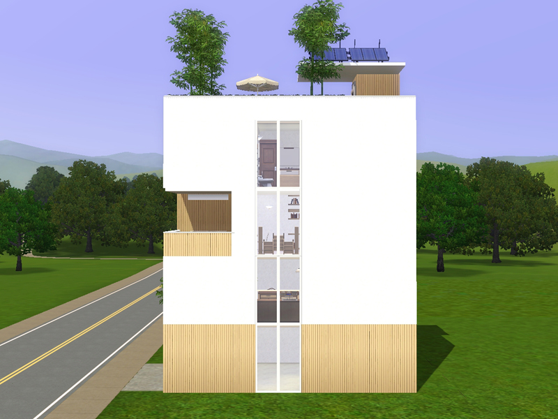 (Built for the Monthly Theme competition on the Forums - http://forums.thesimsresource.com/showthread.php?t=391339) In the future, land is hard to find so people need to build upwards instead of out and around. Of course if you build up then lazy Sims will never get out of the garage unless you install elevators (done!) And what about energy? Never fear, there are solar panels on the roof... speaking of the roof, since you don't have any land, you'll have to do all your gardening up there! This tiny cube features two bedrooms, two and one half bathrooms, a living room, dining room, kitchen, laundry room in the garage, a front deck and a roof garden. Fully Furnished, $98,000.