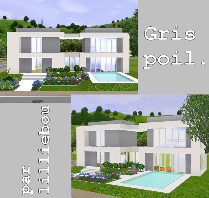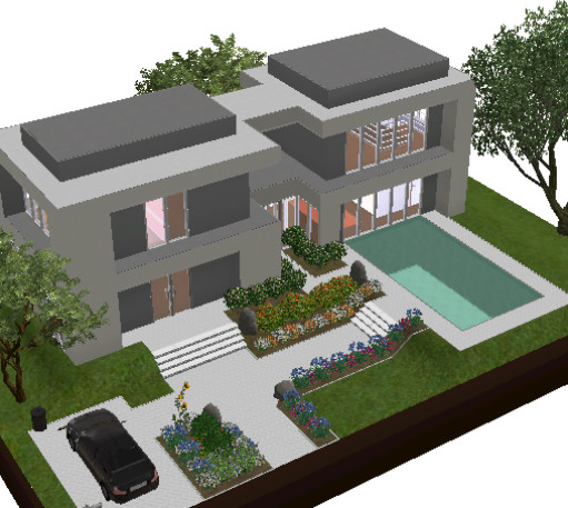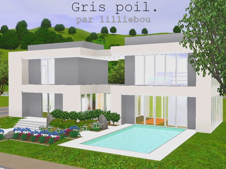 Hi! This modern house has a pool and a driveway. There are also many flowers, plants and some trees. Indoor, on the first floor, there is a kitchen, a dining room, a bedroom, two bathrooms and a living room. On the second floor, there are three bedrooms.