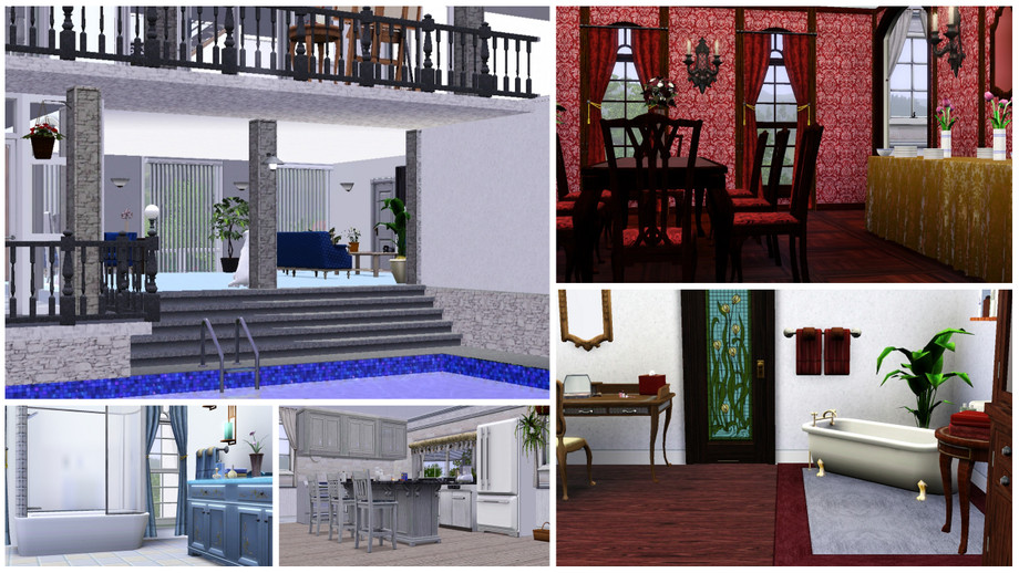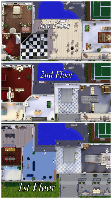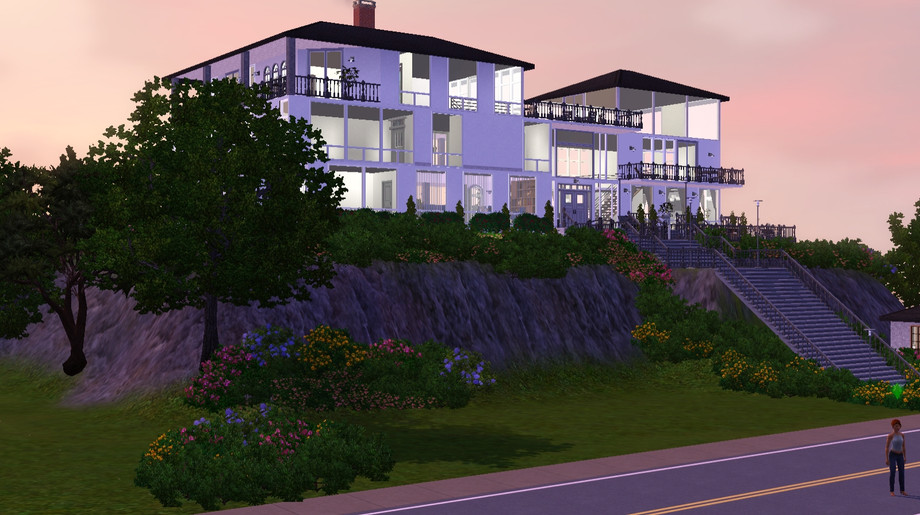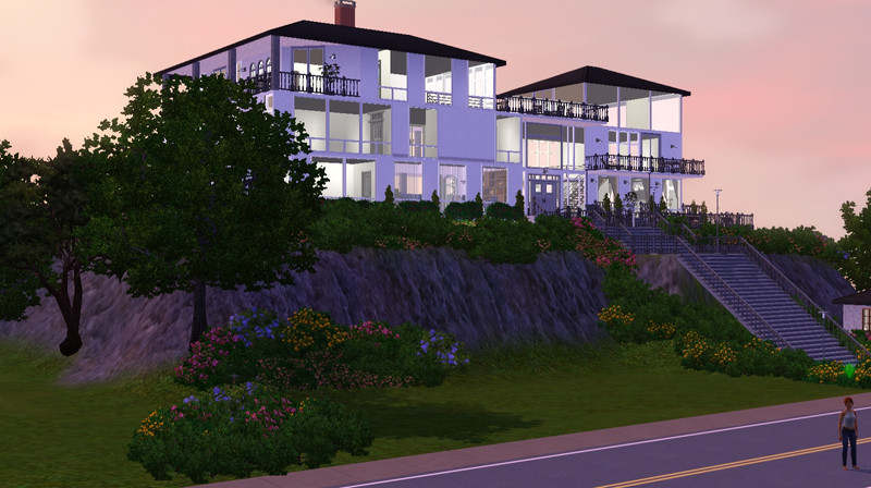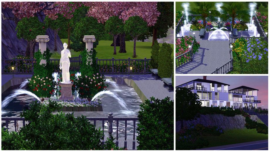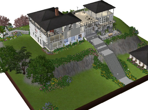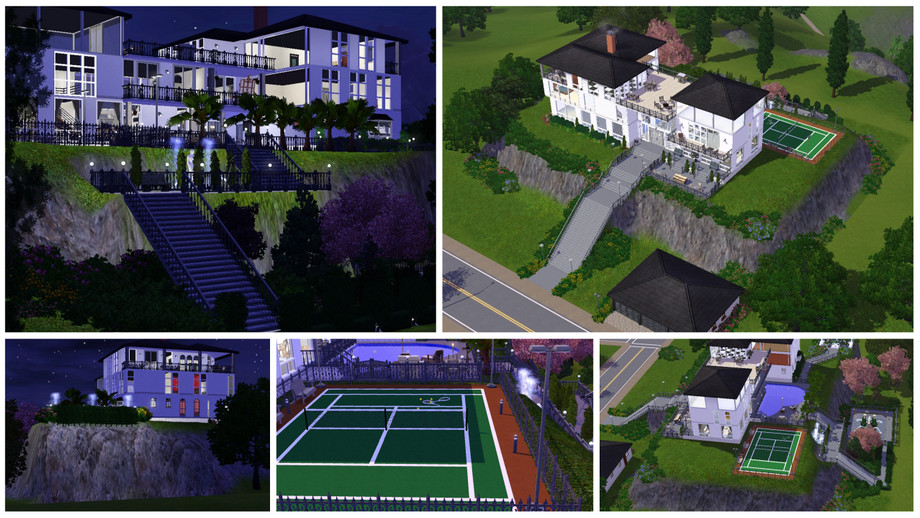 This beautiful cliff home overlooks the bay and all of the town. Gorgeous landscaping covers both terraces. Formal dining room, loft bedroom, open floor plans, open walled den leading right to the pool-these are just some of the features that will make you the envy of all the Sims. Eat your hearts out Landgrabs and Goths! Lot comes complete with a stocked formal pond, gem and butterfly spawners, fountains and more! Fully furnished with matching decor, matching color schemes throughout! The tennis court adjacent to the pool adds to the bragging rights that you will have the most beautiful lot in Sims!!