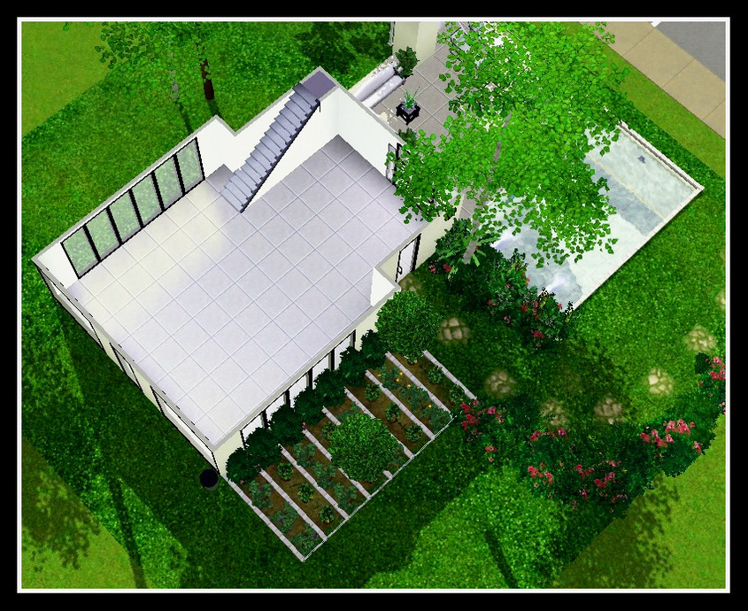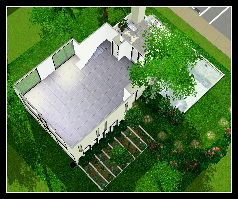 A spectacular Hollywood-style home with a surrounded tropical nature. There are two floors to this home, each a moderate size. There is the flexibility of adding your own rooms or keep a modern-style and go with the open-concept look by adding smaller half walls. Of course there is a pool in the front yard and my first addition of a vegetable garden at the side of the house!