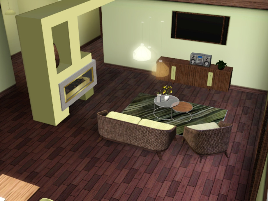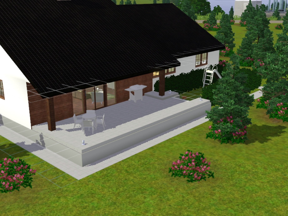 kitchen, dining room + living room, 4 bedrooms, 2 bathrooms, laundry, terrace, playground, place for one car, fireplace
