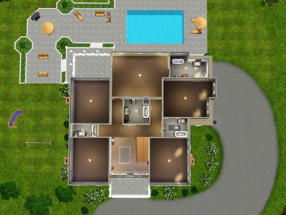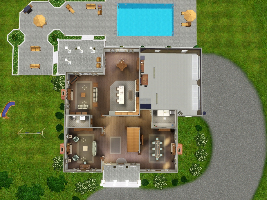 A large family home. The first floor features a dining room, living room, an open kitchen with attached family room and breakfast nook, a gueat bathroom, and laundry room. There are 5 large bedrooms on the second floor, including the master suite. Two bedrooms have attached bathrooms. I left the bedrooms unfurnished. There is also a large 2 car garage, a pool and a lovely patio area for entertaining.