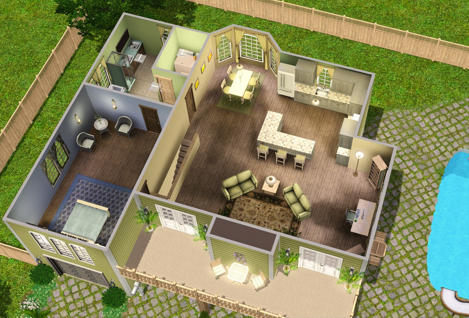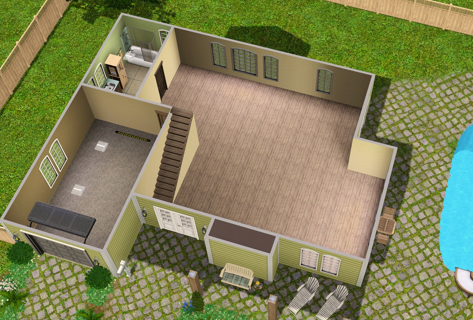 This medium size home has a fully furnished second floor with an open floorplan. Features kitchen/dining/living space, master bedroom, bathroom.