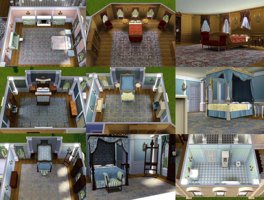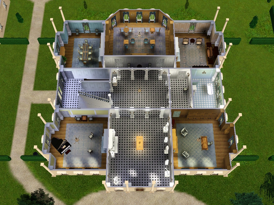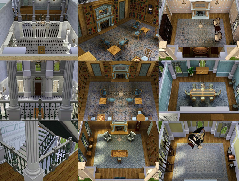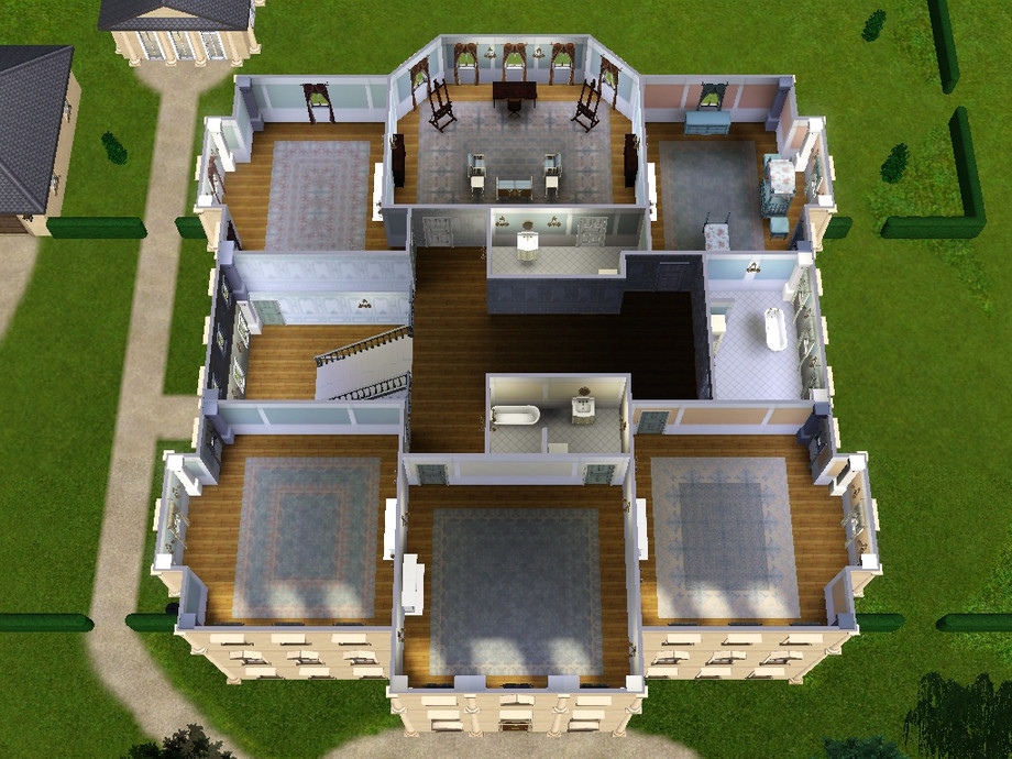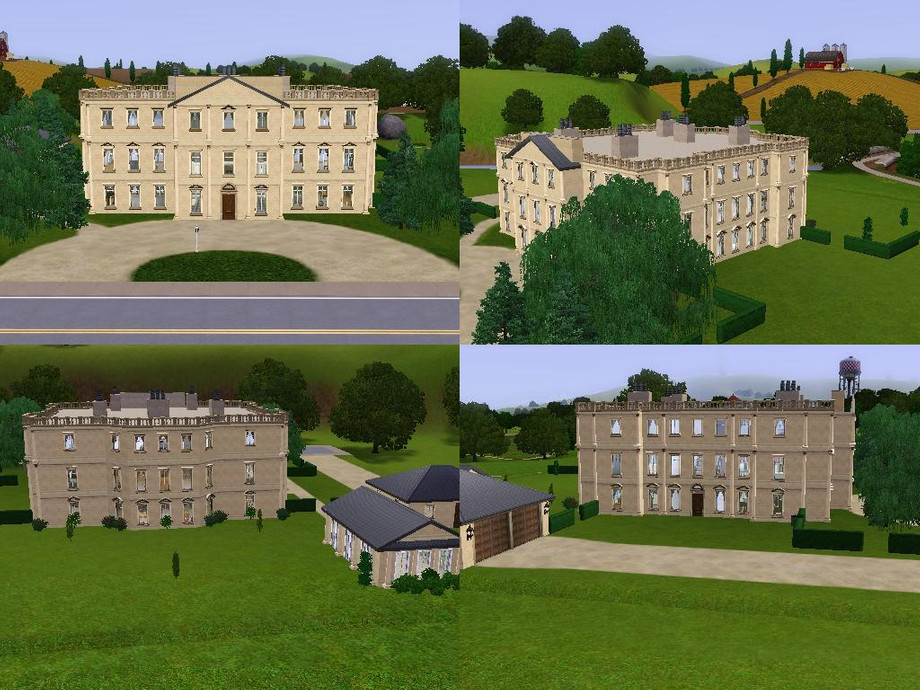 This is the home of Anne Elliot in the 1995 movie Persuasion (novel by Jane Austen), based on Barnlsey Park in England. The first floor includes a grand entry hall, study, music room, library, drawing room, bathroom and dining room. The kitchen is located in the basement. The second floor has up to five bedrooms, including the master suite, and a family bathroom. The third floor has up to six bedrooms, two with bathrooms ensuite, and a family bathroom. I made one room on this floor into an art studio. Each room has a custom sized rug which I made from carpet tiles. The house is mostly furnished, though I did leave some rooms on the third floor empty so you can fill them with whatever you wish. We certainly don't need eleven bedrooms! Outside is a two car garage and a little building which can be used for a summer house or a green house.