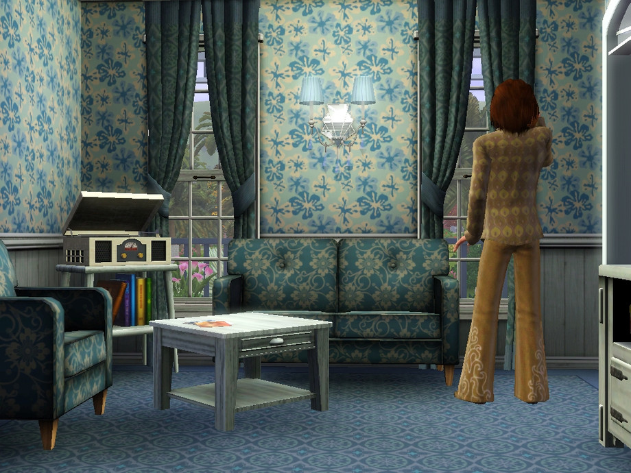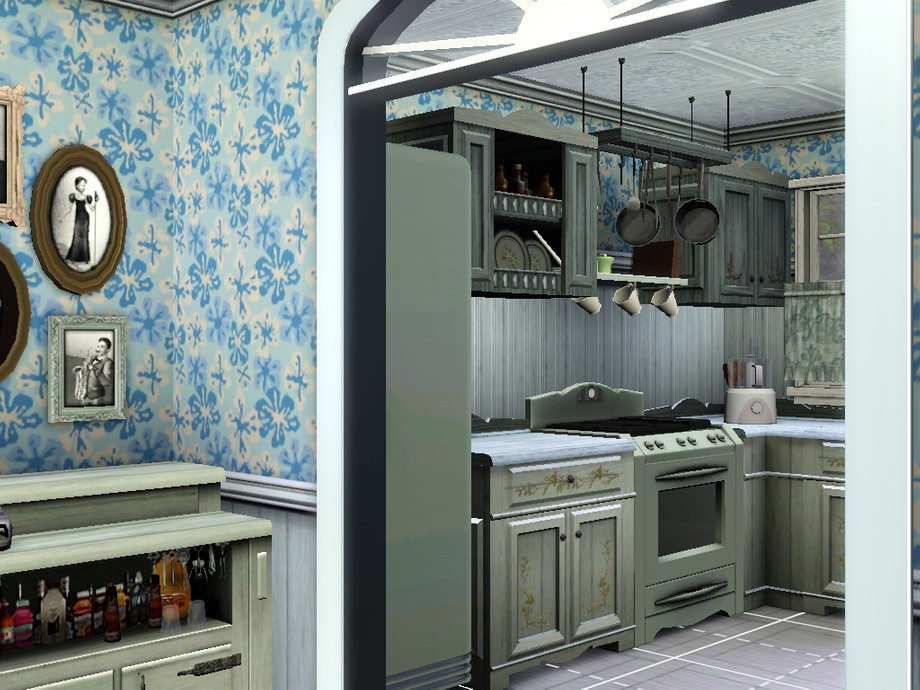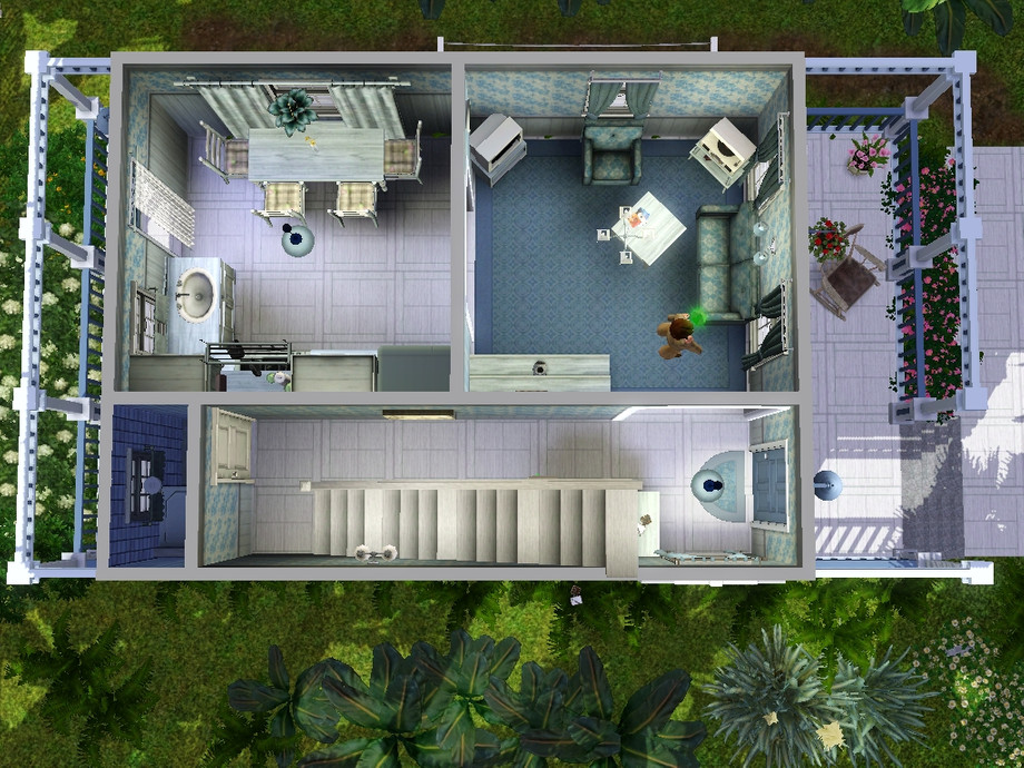 The cabin consists of two floors and a courtyard overgrown with tropical vegetation. The ground floor has a kitchen, living room and a tiny laundry room (if your sim lazy to wash, instead of a washing machine where you can put additional toilet).