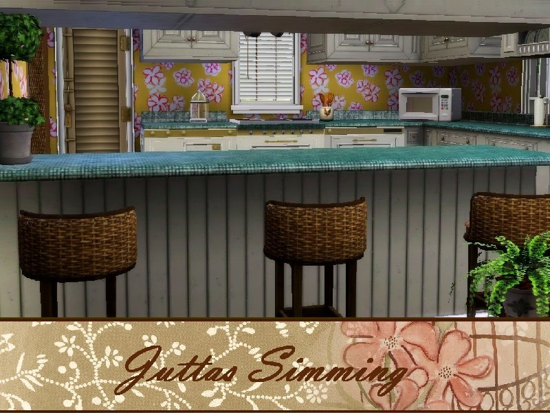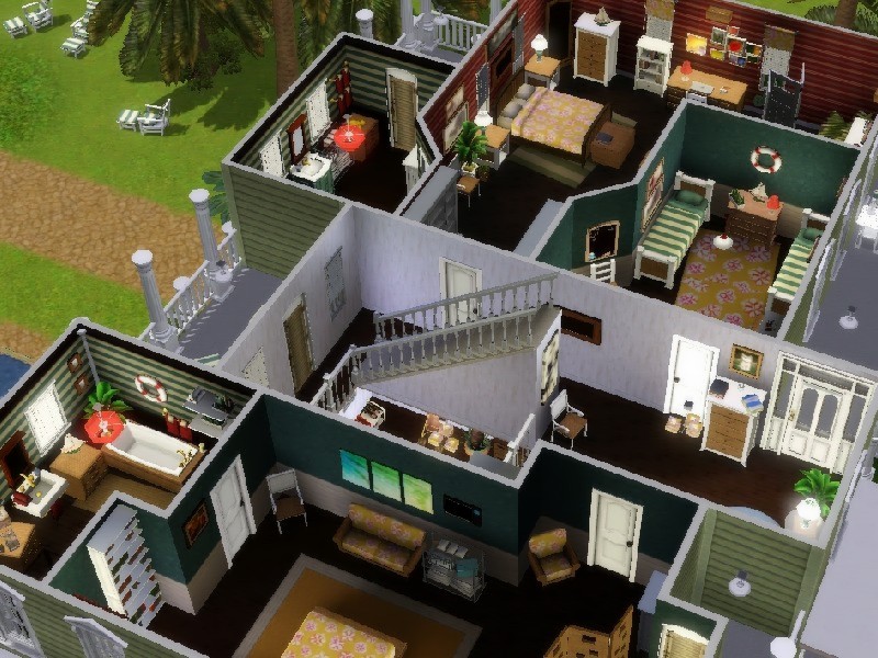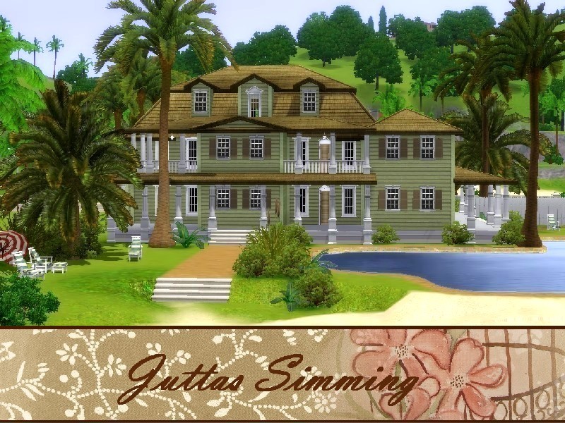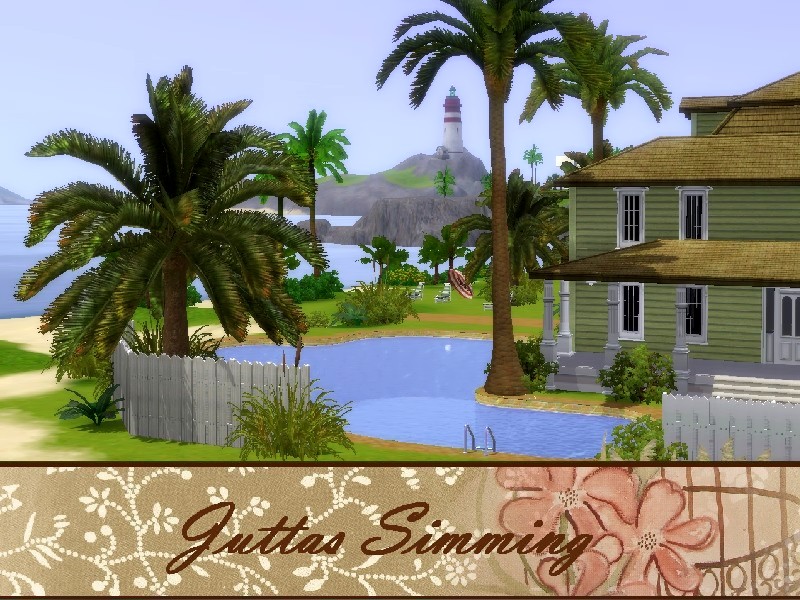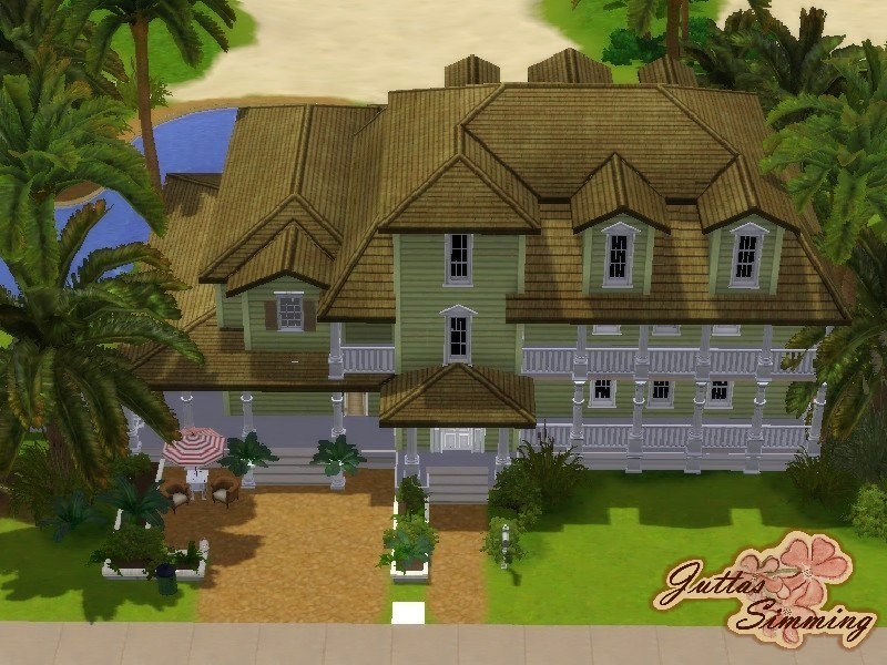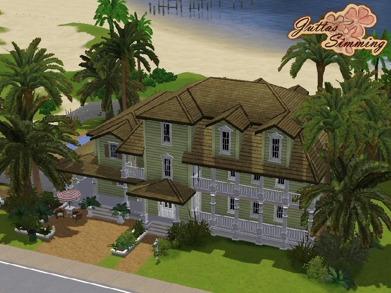 This large house has two double bedrooms and a twin bedroom. It fits a 40x40 lot. The garden faces the seaside and contains a large pool. The home has plenty of sunny space on it's balconies. The furniture has a nautical theme. The loft is converted to a party room. This house fits best in Sunset Valley, 455 Sunnyside Blvd. No custom content used. JuttasSimming