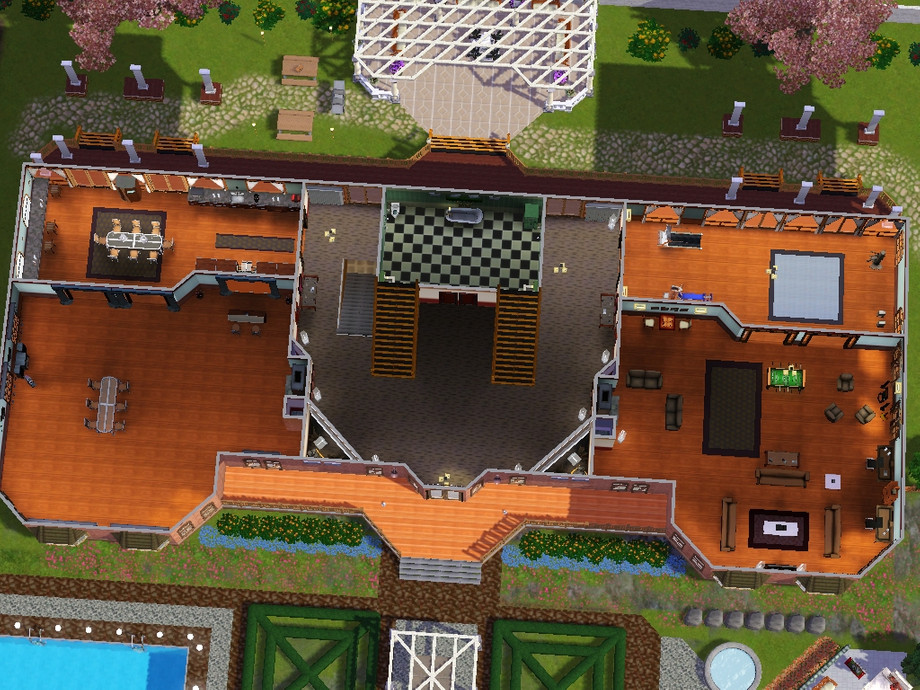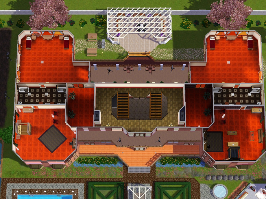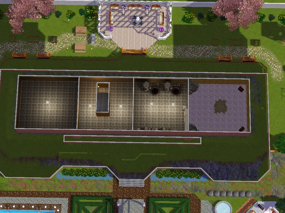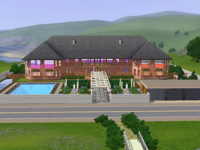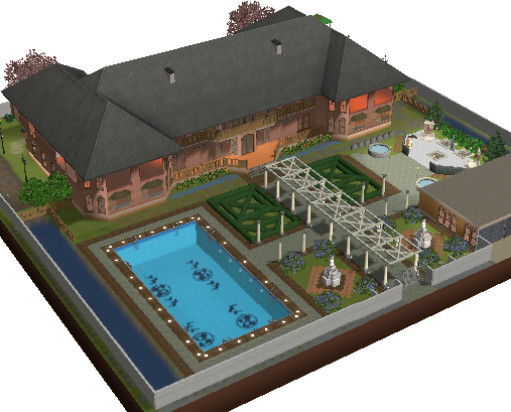Luxurious manor for the filthy rich sims. It was built mainly above a lake. This houses main features include: Outdoor Pool, Pagoda, Fountain, Fireplaces, 4 large bedrooms all with en-suite bathrooms and a spacious study. Other features are hidden rooms and secret studies, a pull on the occasional wall light reveals it's mysteries.