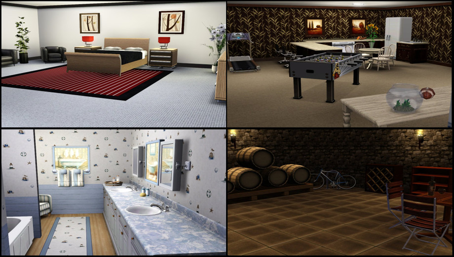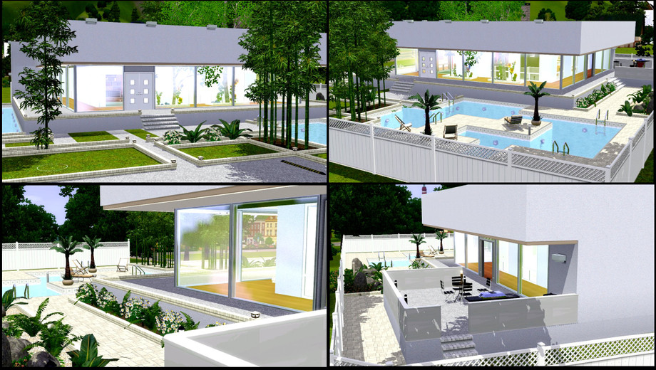 Do your sims or legacy sims dream of a modern home so spacious and beautiful? Well here you go! Plenty of room in this open floorplan on the main level which includes living room with fireplace, kitchen with kitchen island, dining area, small study area and full bathroom. Subterranean level includes 4 bedrooms, 3 bathrooms, hobby/activities room with kitchenette and an area for your laundry appliances. Basement is a wonderful cellar to house your wine. Beautiful pool, grilling area, and modern landscaping. Enjoy!