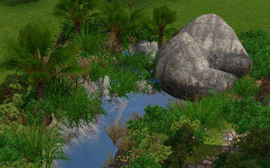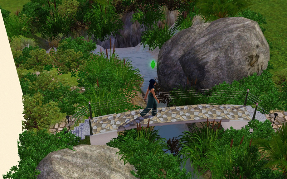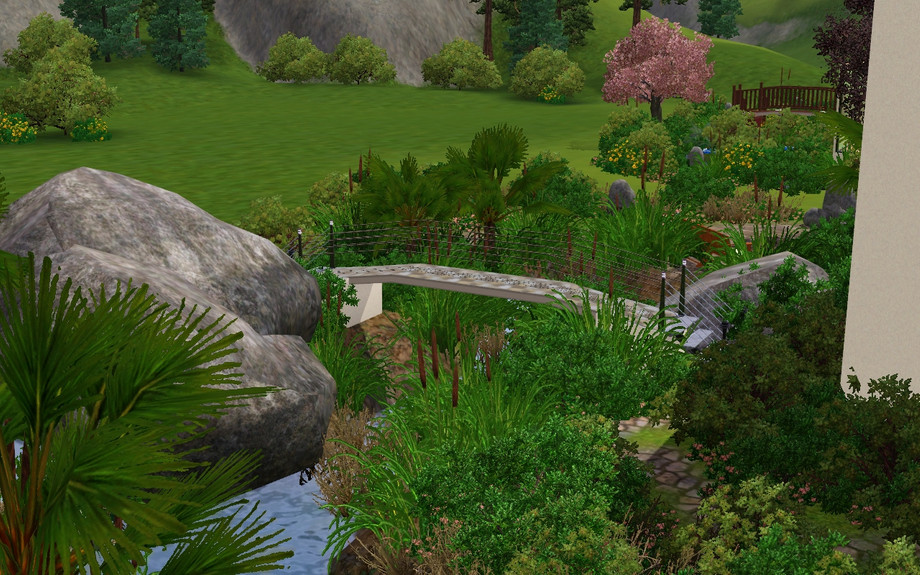 This began as a starter home, so the house inside is still pretty stark, but the grounds around have been fully landscaped with waterfall, a small ''creek'' and a bridge connecting a pathway around the house. There is a spot for a car, but no parking space has been purchased. For the sim on the rise...! Enjoy! ~wolfmush~