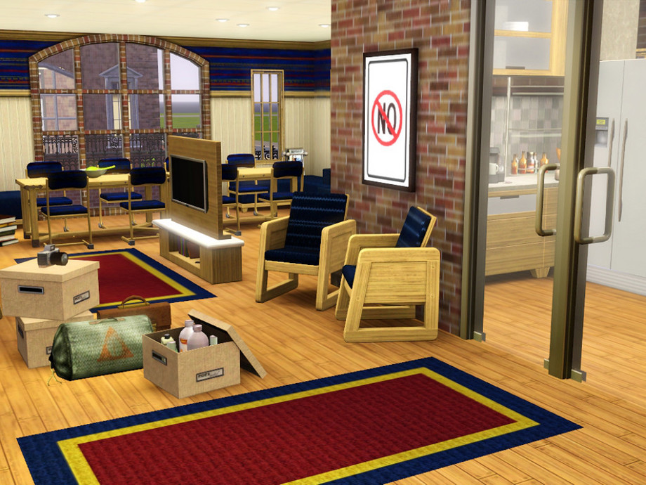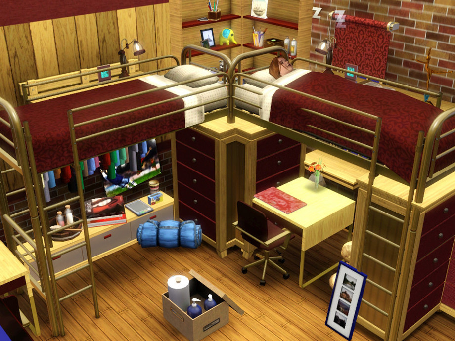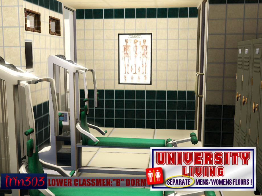 A dormitory-style apartment featuring classic mens only and womens only floors! Entry-level students enjoy semi-private rooms and a workout room on each floor. Traditional brick style is just right for University World. Bonus top floor for you to decorate! Stairs and yes, elevators for that in-a-hurry sim. College living in a class by itself. Same school, different rules! By trin303.
