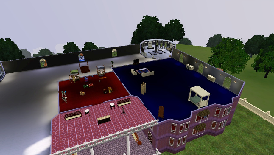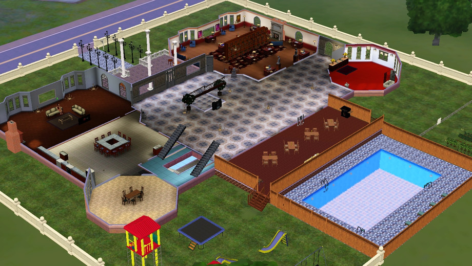 Ok I finally took a shot at creating a house. This is doing it waay big. Four floors plus a semi-finished basement. There are currently three bathrooms but plenty of room to add more. So far there are four bedrooms. The 4th floor is good for an attic and the third floor is the master bedroom with nursery. This glorioius mansion is complete with playground, pool and a garden. OH and there's an underground garage complete with 4 cars (I forgot to take em out before I uploaded). Please do enjoy this house. And tell me what you think. But be gentle its my first time. :)