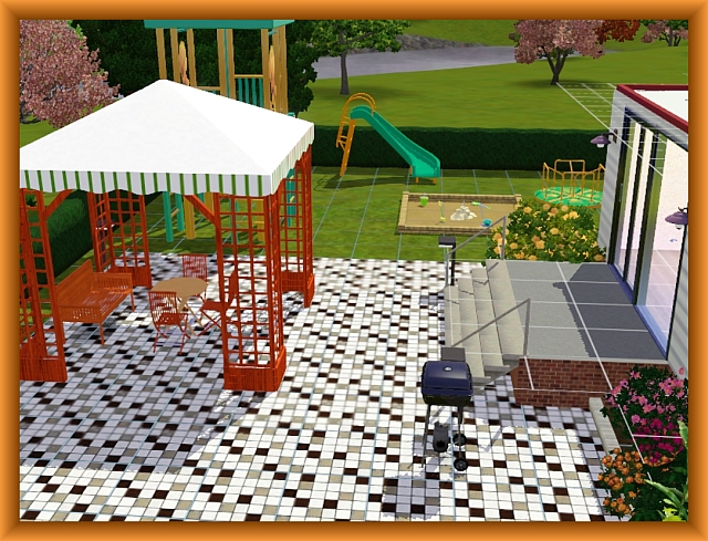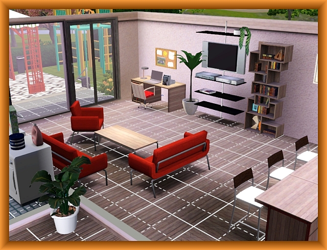 This home is for a sim family with one or two children. The spacious hall leads the visitors in in all the other rooms of the house. On the right side are the kitchen and the livingroom. In the middle there is the bathroom with a little laundry included. Leftside there are the sleepingroom for the parents and the childrens room. In the backyard is a swimmingpool, a nice veranda and a great playground for the children. On the right side of the house is a carport. Enjoy!
