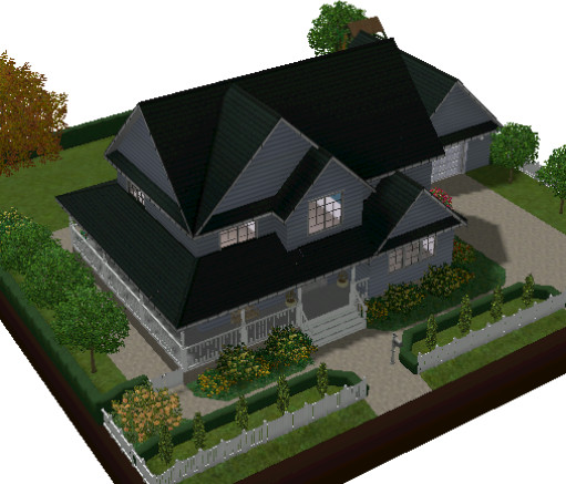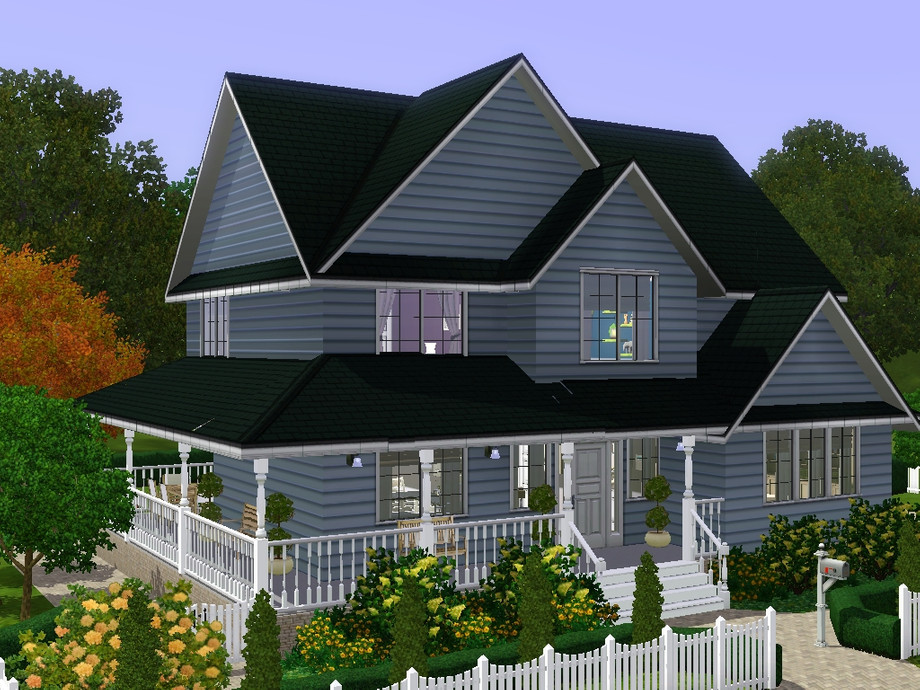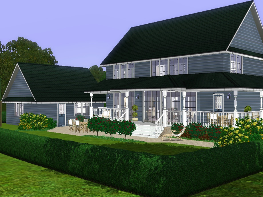 Grand American style family home with spacious living and office area and dining and kitchen area on ground level. Upstairs are 3 bedrooms, a bathroom and a playroom. Outside there is a covered porch surrounding most of the house and a separate garage. The garden has a spacious terrace and lots of room for the kids to play in.
