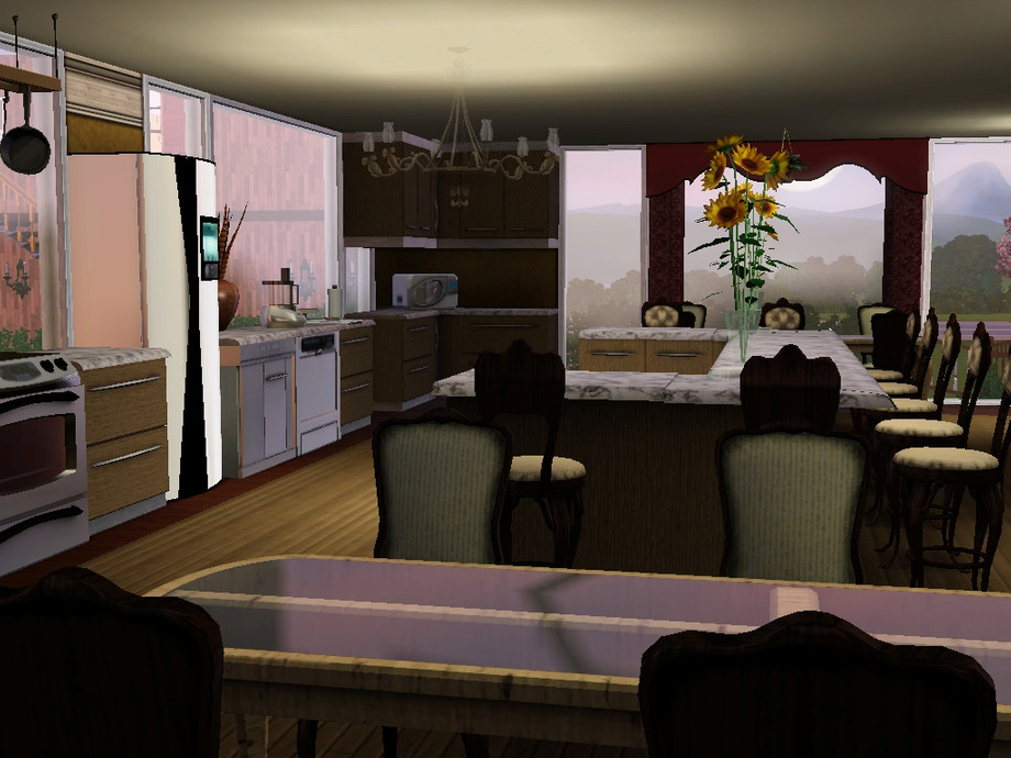 Loft above the two-car garage has one bedroom, kitchen, and one bathroom, inspired by Mom's House on The Sims for PS2. Home is fully furnished, worth $480,784. It rests on a fully accessed 40x40 lot with a landscaped yard and ornate garden. Basement has expanded workout studio and beautiful view to the underground paradise. Kitchen is spacious, fully loaded with tables and islands for dining. All bedrooms are on the second floor, including one master, one guest, and two children/teen rooms. Home office is also on the second floor.