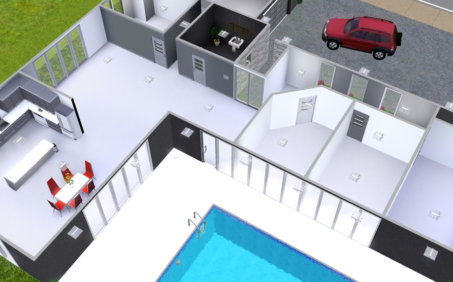 One story house featuring plenty of space to live and enjoy the pool as your sims relax by. Only kitchen, dining room and bathroom are full stuffed and furnised. Lights are included both internally and externally. Enjoy playing!