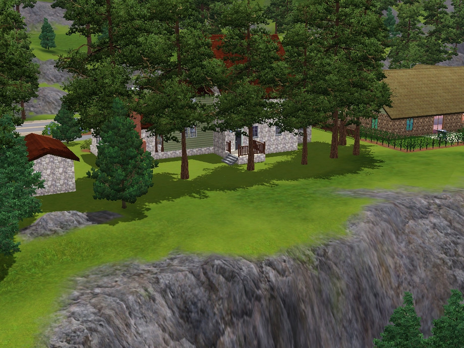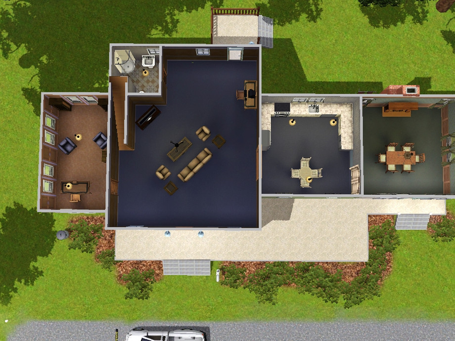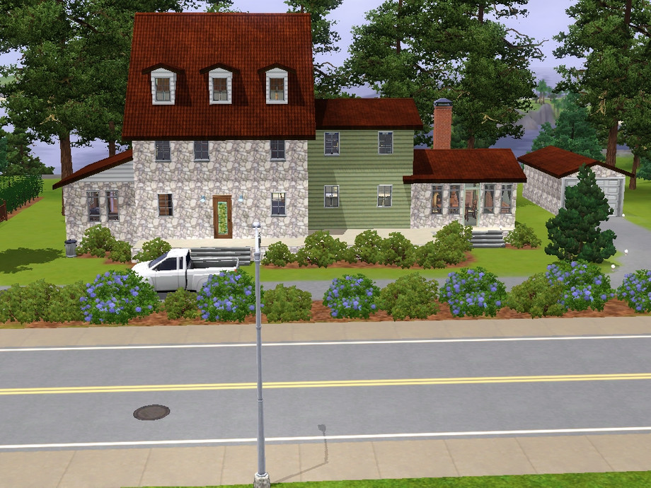 A house meant for a large family. Room for lots of children. The 3 bedrooms on the second floor all have a full sized bed, double dresser,and night stands. The master suite is on the third floor. There is a bathroom on each of the three floors. A study/library, for the Sim who likes to read and study, is on the first floor, left of the front door. The dining room is on the far right with all of the windows and a door leading to the deck.