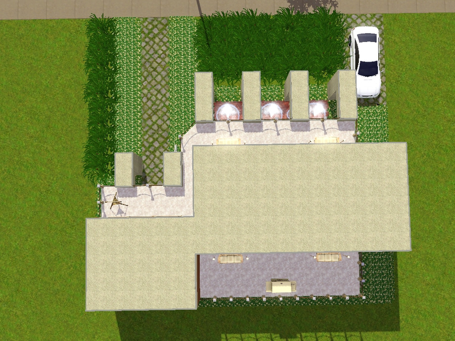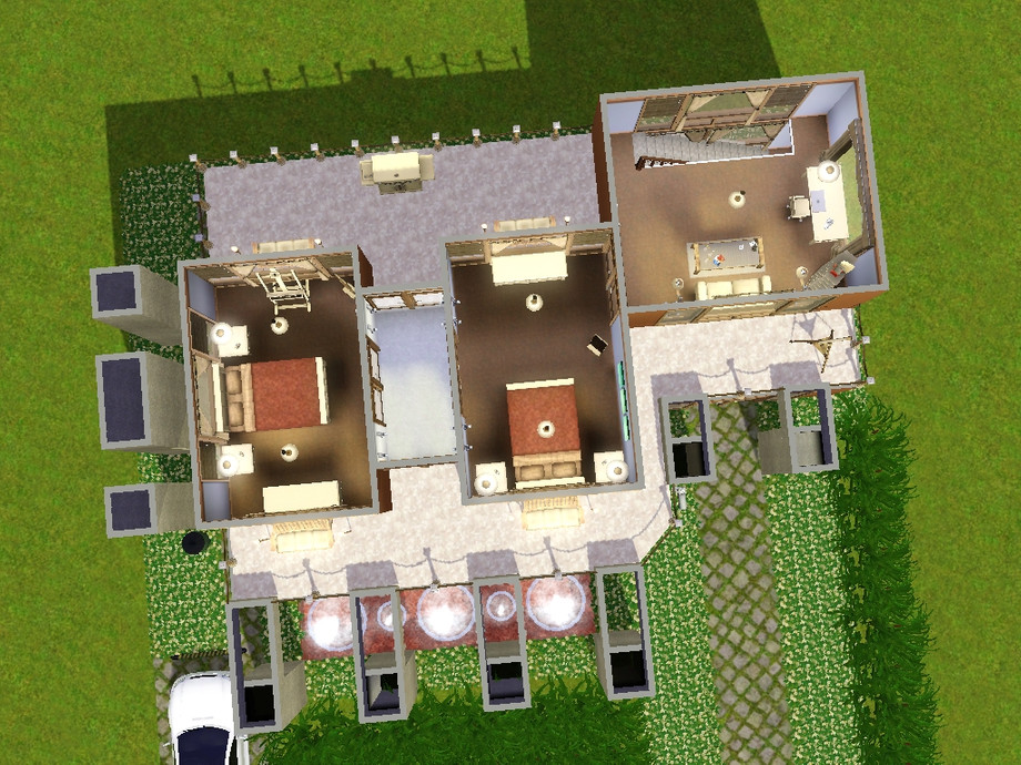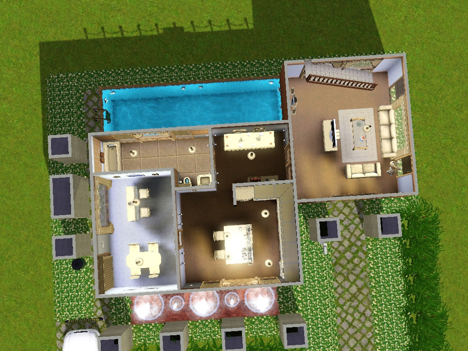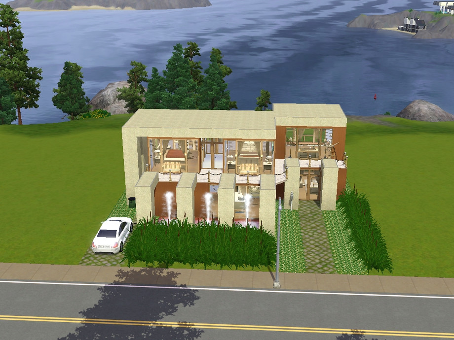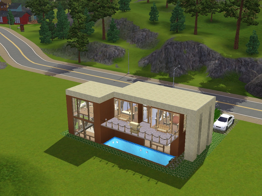 Modern type house with a pool in the backyard, 1 car-spot (car included), living room, kitchen, dining room, and bathroom--all on the first floor; and a study room, two bedrooms, along with 2 outdoor patios on the second floor. It also has a foundation roof. It has a very nice fountation in the front yard too, in between a few pillars. :)