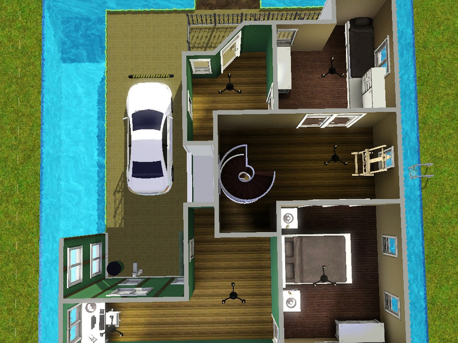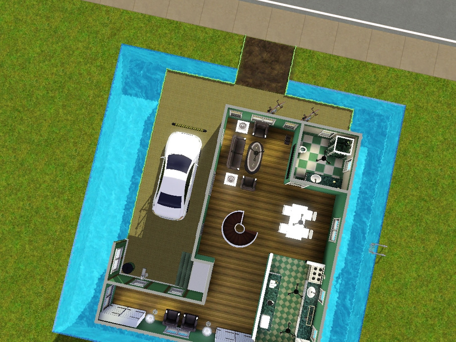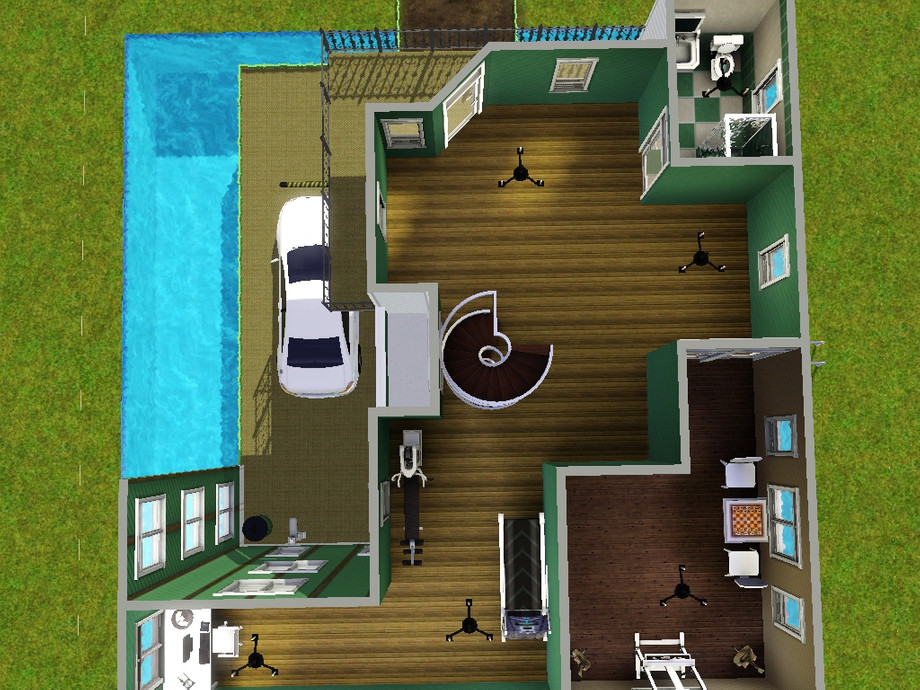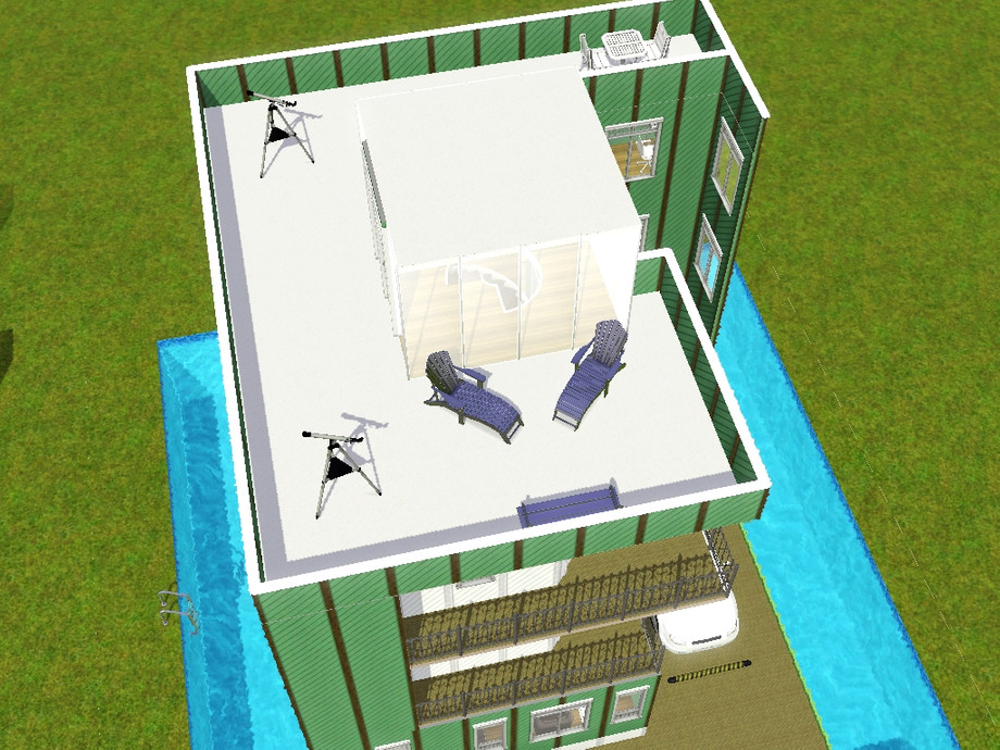 Mint Cova, a beautiful modern-type home with a pool surrounding it. It is four stories tall (which includes the patio on the roof). It has a nice living room, kitchen and dining, study area, 2 bathrooms and 2 beds, a couple of gym items for athletes, and a car spot with a car included on a platform.