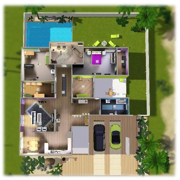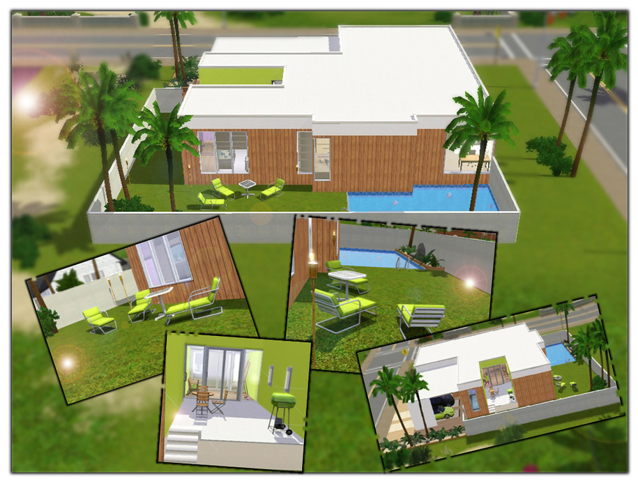 This modern home situated near the beach is perfect to suit a family of three. Your sims will be amazed by the modern interiors and the beautifull view of the sea. This one story house includes 2 bedrooms, 2 bathrooms, kitchen with dining area, a cozy livingroom, an office and a small deck with a bbq spot. In the backyard your sims can relax on the fresh air, swim in the pool or sunbathe. There are also 2 parking spaces in front of the house. It is fully furnished, decorated and beautifully lanscaped. All you need to do is just move in! Enjoy!