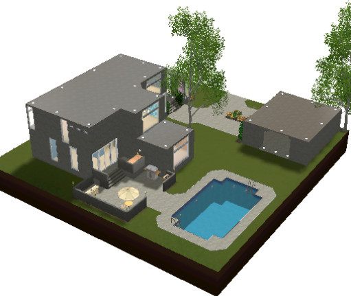 A modern grey house for a family of four. The lot has a pool and a barbeque area in the backyard for late summer nights. There's also a car port with room for two cars. The house is filled with bright colors and a light wooden floor.