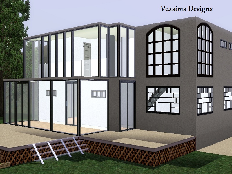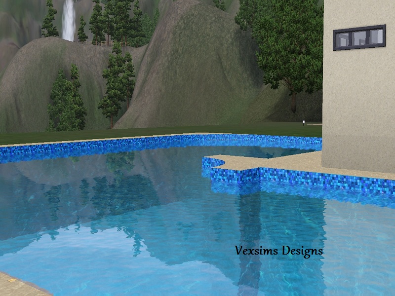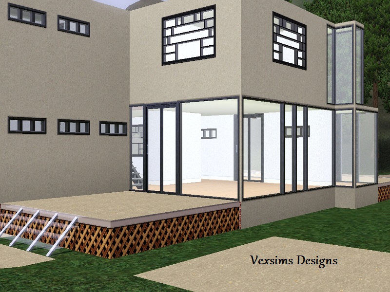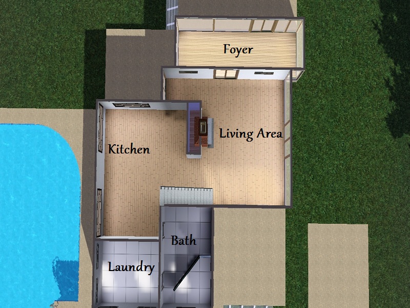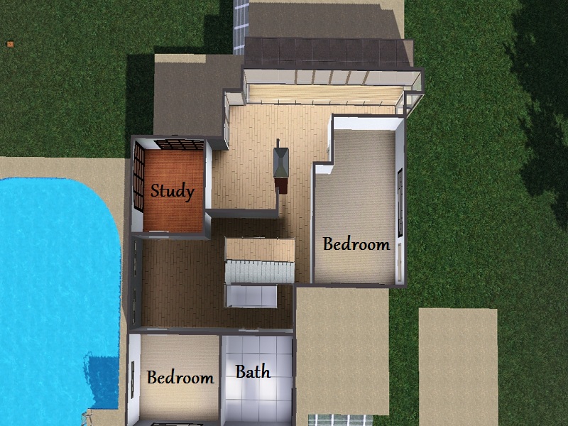 A simple modern home for your sims! This 2 (possibly 3) bedroom modern house also has 3 bathrooms, a spacious kitchen and living area and a very large garden, fit with a pool and a patio.