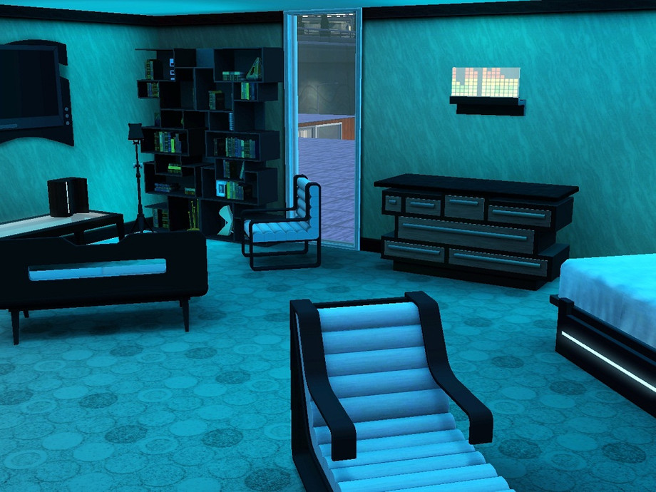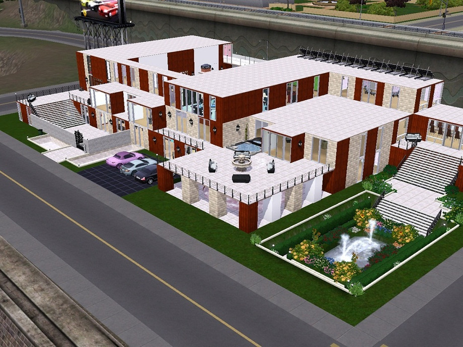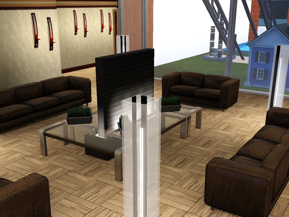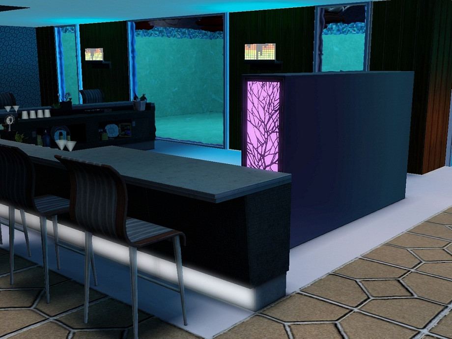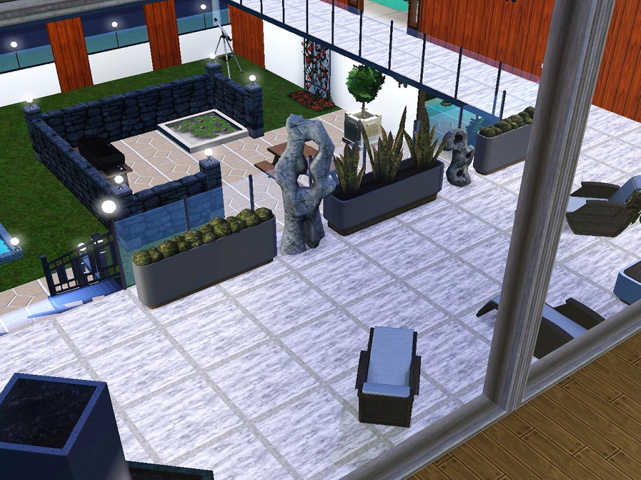 A three-storey modern house (with basement). Two pools, spacious living/dining room, party room, kitchen with bar, outdoor patio area, four bedrooms on the third floor and a spare room on the ground floor. Your Sims will love the large open rooms and wide windows!
