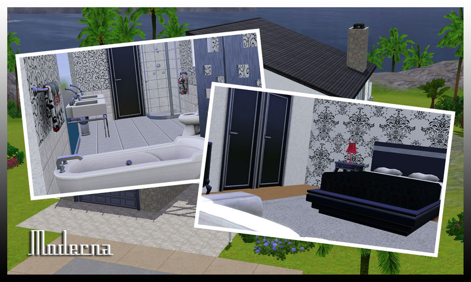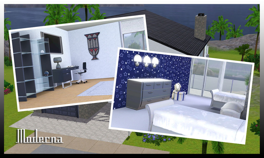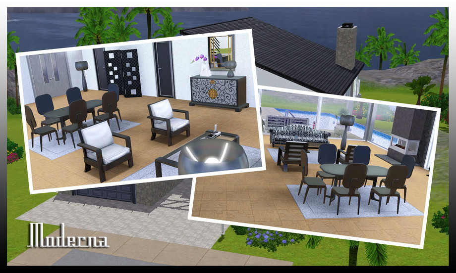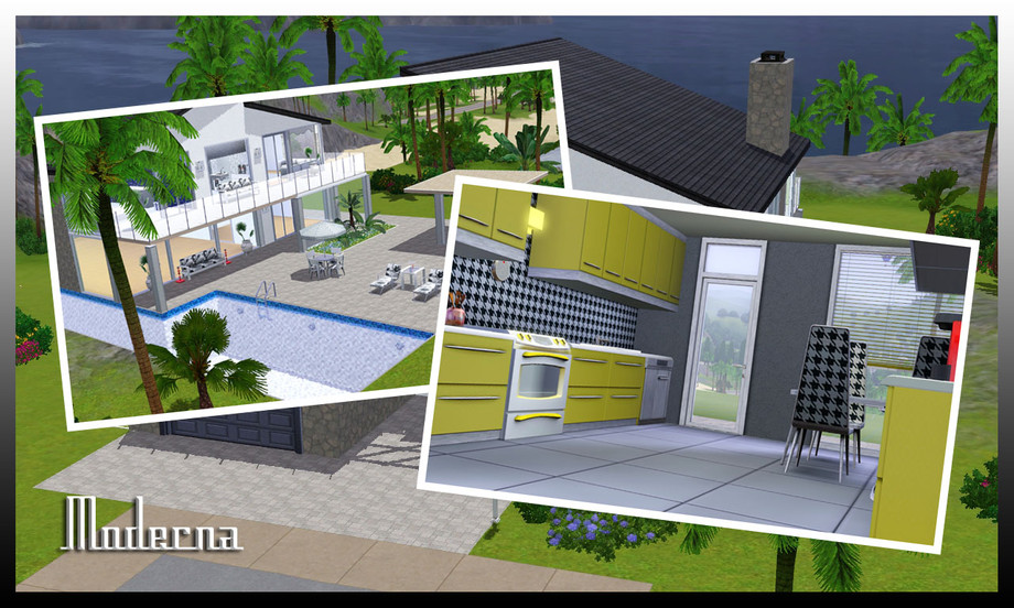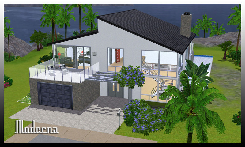 The Moderna is a comfortable home for the wealthier Sim. It boast a large living/dining room, a study, a kitchen, 3 bedrooms, 2 bathrooms, a garage, and a patio with pool and bar. Needs the doggie from the free Xmas pack at the Sims 3 store.