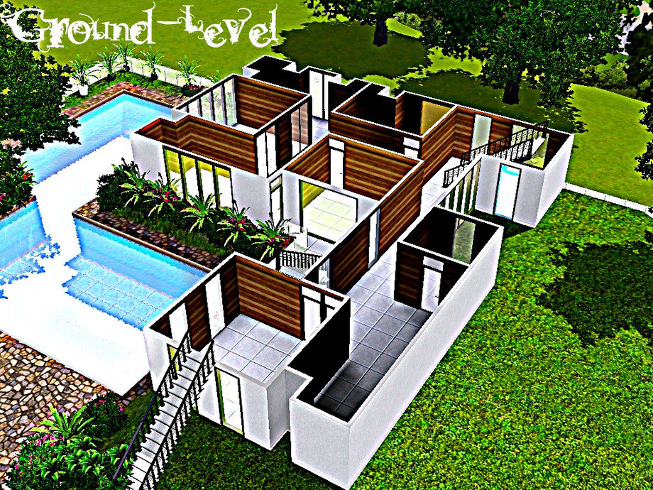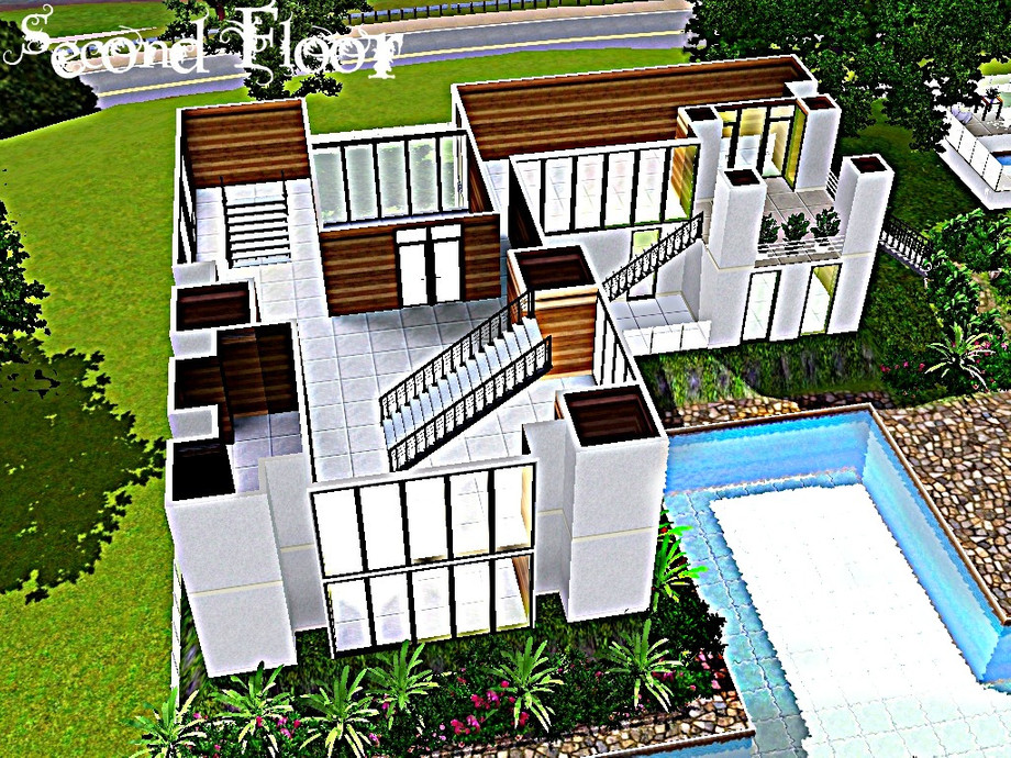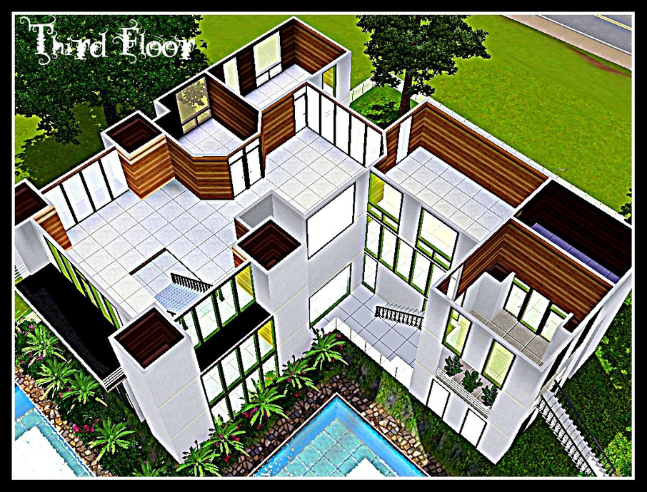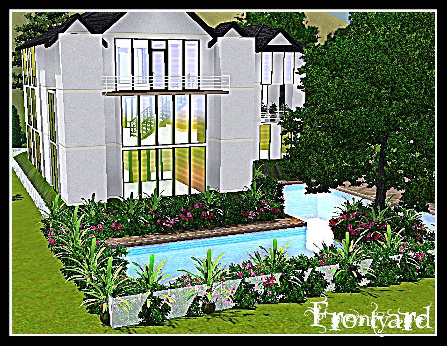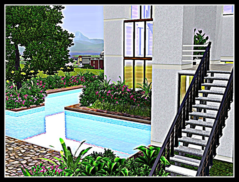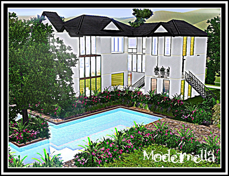 An extremely large modern home with plenty of rooms and even more space. Surrounded partially by a luxurious pool which, itself, is surrounded by trimmed plants, it's almost like an island. (...just not...) There are three floors to this large estate, consisting of 11 rooms, large enough for anyone!