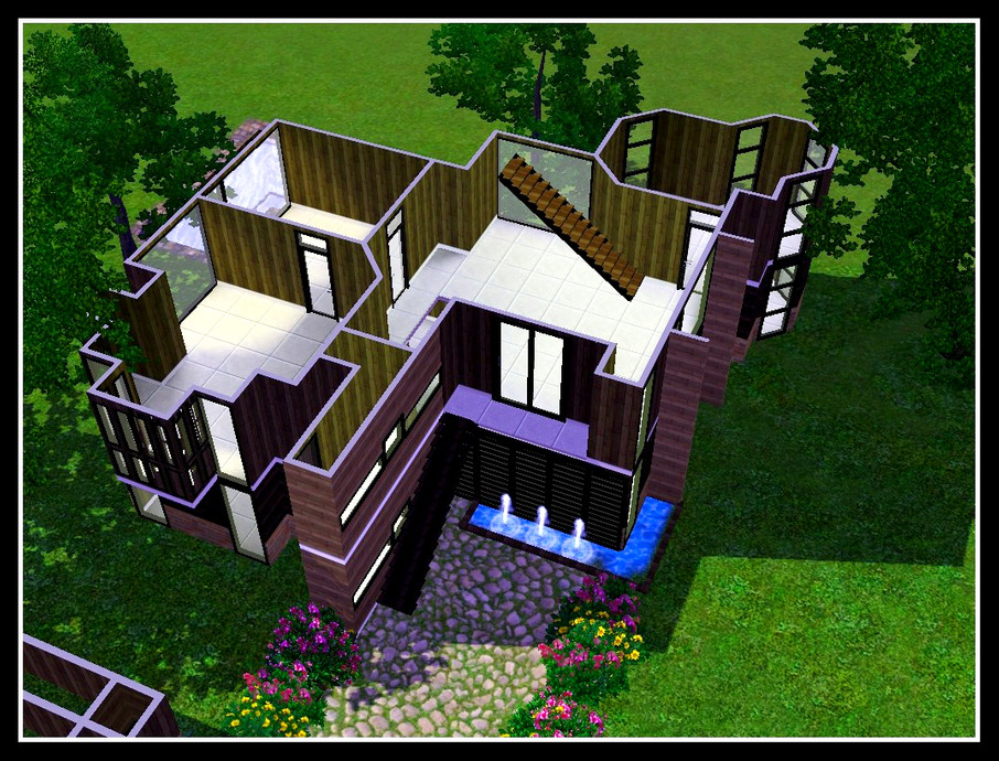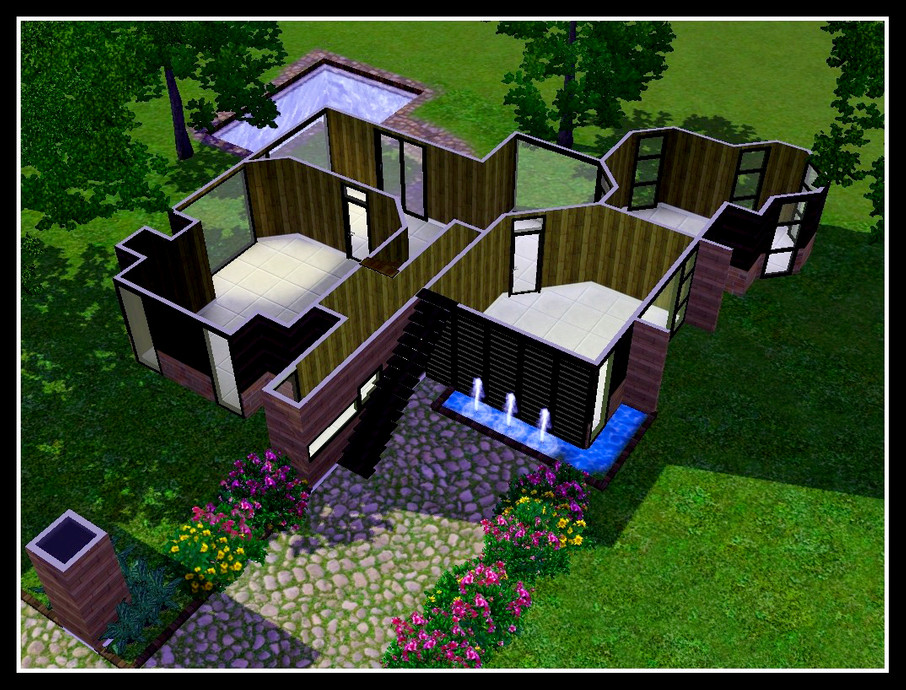 Modo Mansion is a modern home with simple fountains in the front and a carport on the side. The rich dark brown of the panels add style to the dark black windows that accent the home.