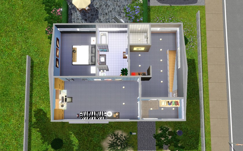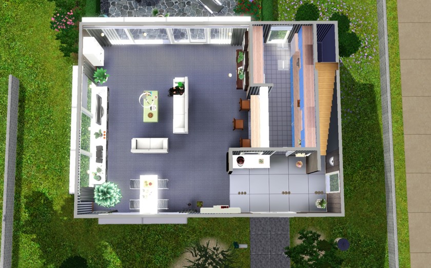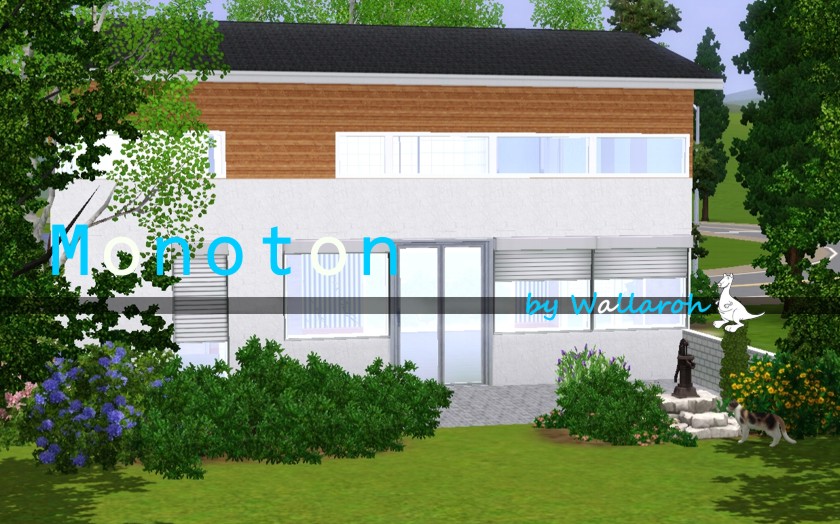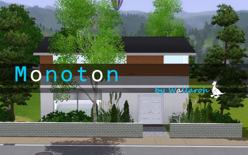 Monoton - Stylish lot for modern single male sims. This is my first creation afte my big Sim-World-Crash. The last update gave my installation the rest and i take the chance to re-install my computer from scratch and get a free girl doll dressed installation. The lot has a big livingroom, a furitured kitchenette, a bathroom, bedroom, walking wardrobe (my favourite room) and a office-corner. The garden has enough space to free your mind and relax. The house is partly furnished with a kitchenette.